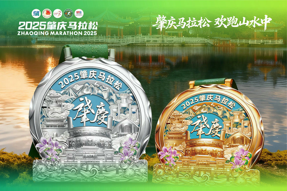 本届赛事奖牌与参赛服在设计上深度融合肇庆城市文化。奖牌融合七星岩牌坊、古城墙、鼎湖山九龙宝鼎等标志性元素,延续“肇马”一贯的山水人文风格。