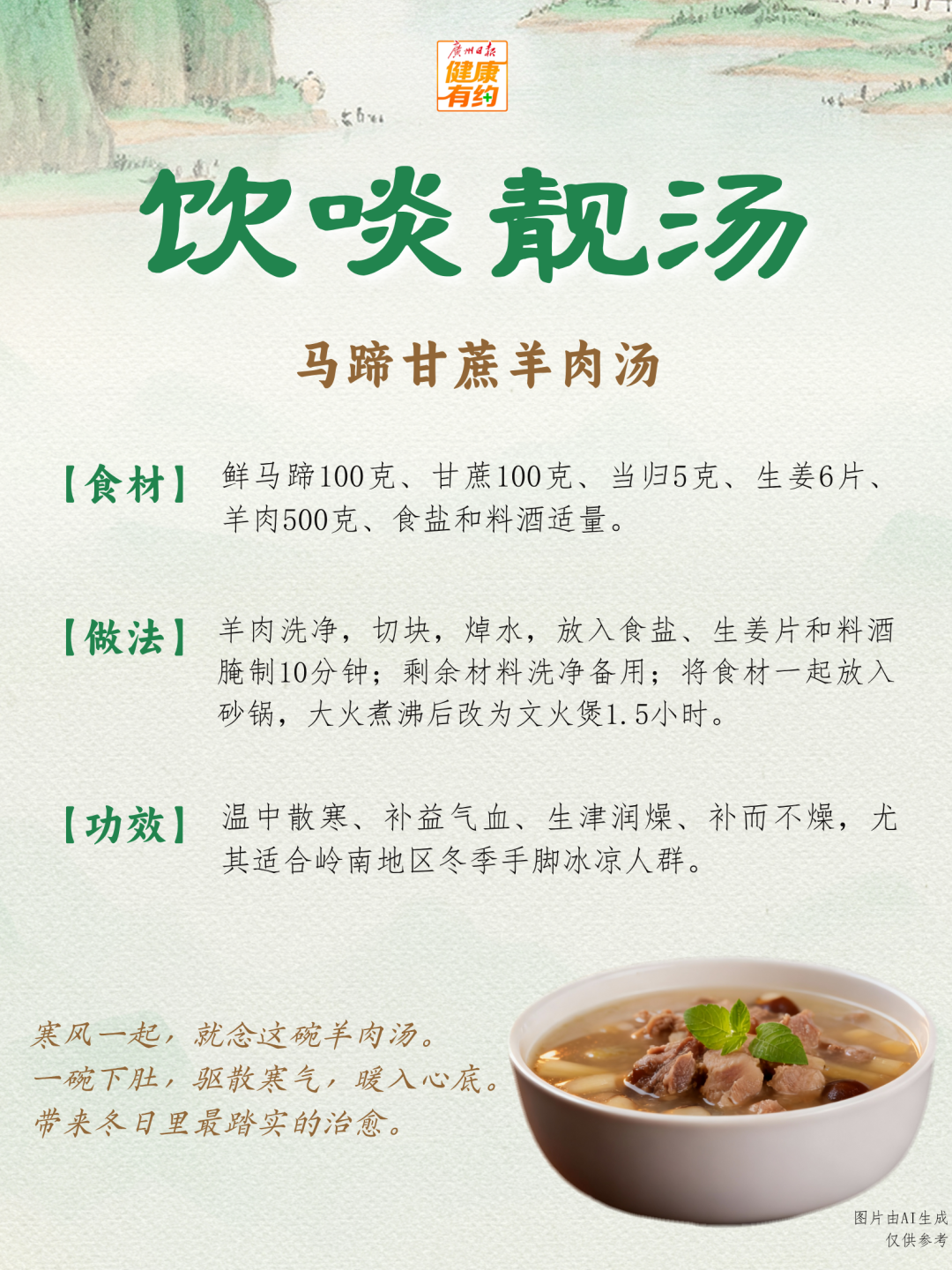 这款汤能温中散寒、补益气血、生津润燥,尤其适合岭南地区冬季手脚冰凉的人群。