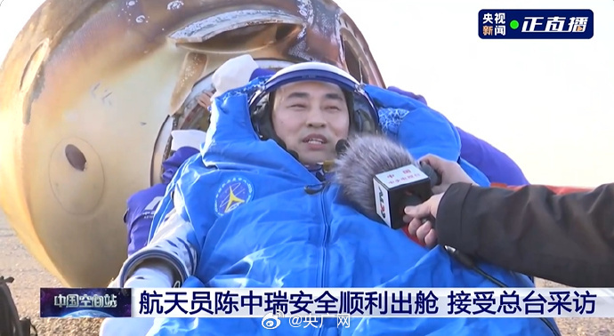 陈中瑞说:“今年4月24日我们从这里出发,飞向太空,执行为期半年的飞行任务,在我们乘组一心,天地一体的密切配合下,圆满完成了所有的工作项目,完成了党和人民交给我们的任务,我感到特别开心,特别幸福。”“宇宙无垠,但因无数人的坚守而温暖,感谢所有默默奉献的航天人,感恩祖国母亲让我圆梦太空,祝福伟大的祖国更加繁荣昌盛。”