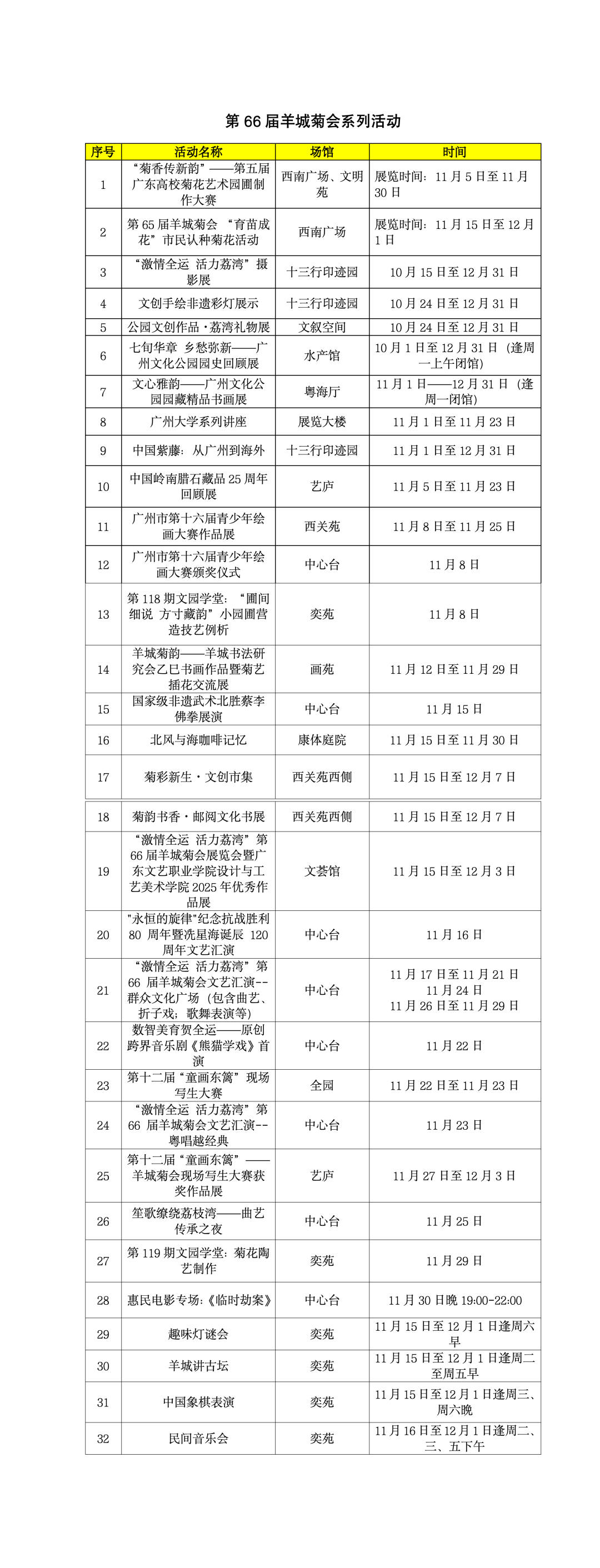 其中水平较高的展览演出活动有“激情全运 活力荔湾”第66届羊城菊会展览会暨广东文艺职业学院设计与工艺美术学院2025年优秀作品展(文荟馆)、羊城菊韵——羊城书法研究会乙巳书画作品暨菊艺插花交流展(画苑)、国家级非遗武术北胜蔡李佛拳展演(中心台)等活动。