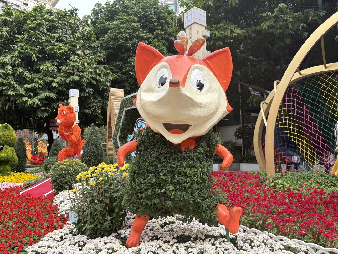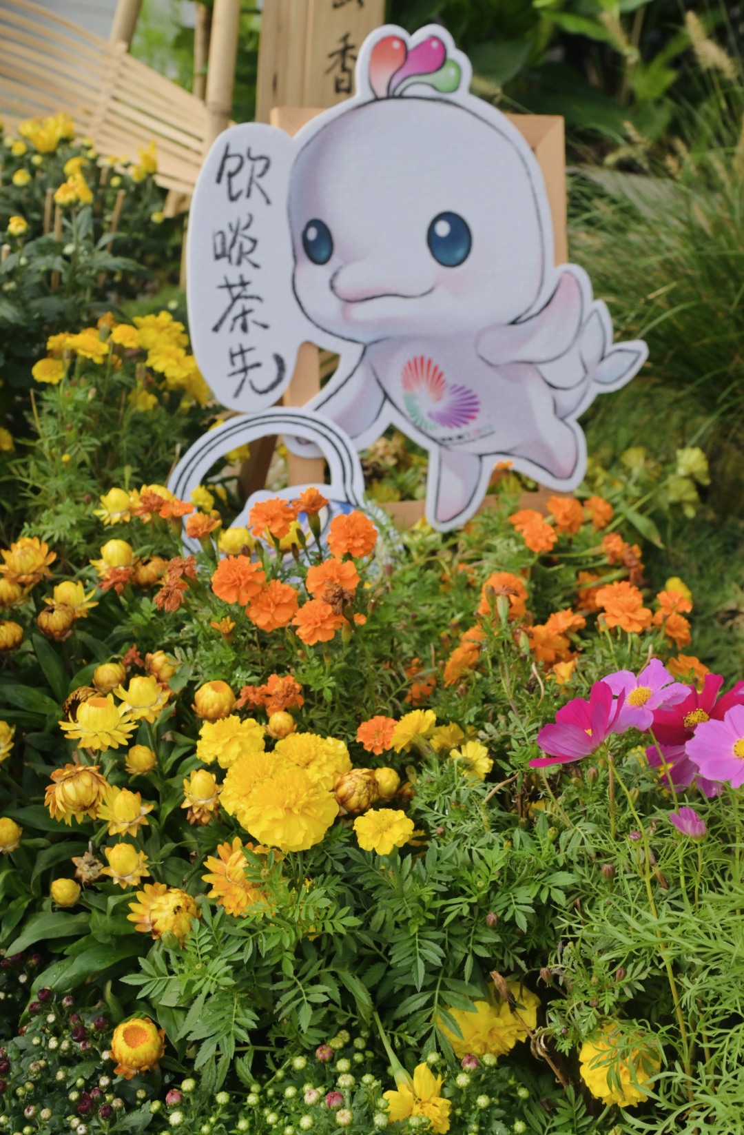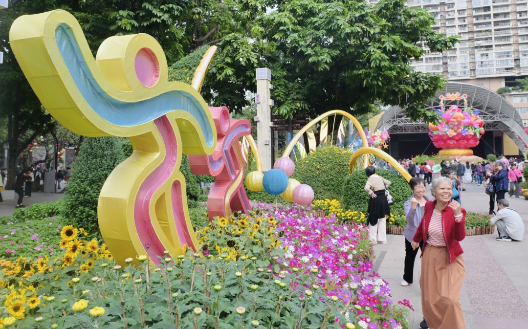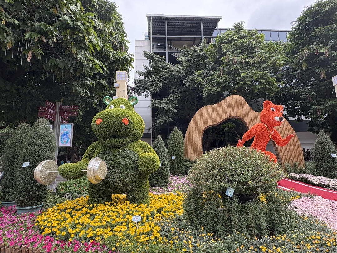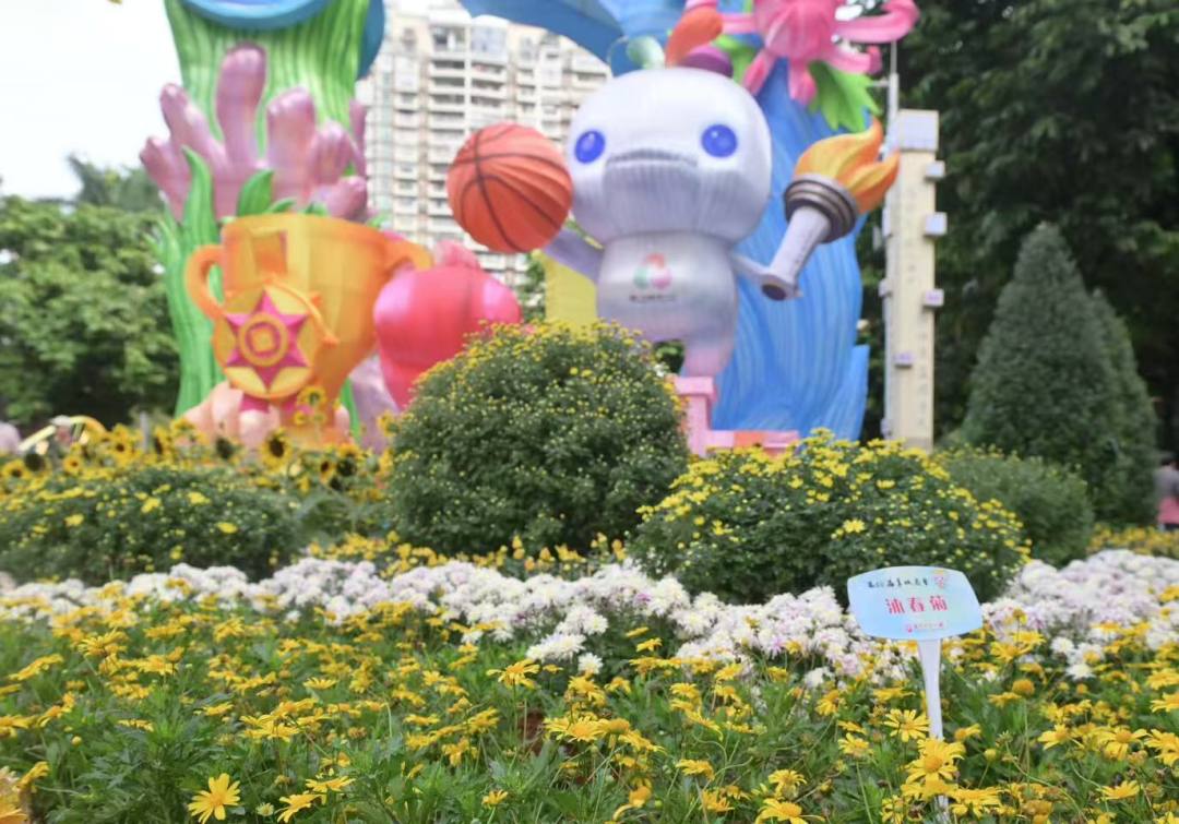 《花漾律动》以木棉花瓣拱门、风动墙、运动剪影造型展现出活力与动感。河马举重、花豹赛跑、松鼠踢球、企鹅游泳……《萌动菊园》景组打造的动物运动会赛事场景十分动感有趣,吸引了不少人。《悦动凝萃》中菊花扎作的足球、排球、羽毛球等菊花造型,把全运会的激情与活力融入静态的园林艺术中,让市民在赏菊之余感受全民运动的浓厚氛围。《悦动凝萃》以菊花扎作技艺,生动复刻了广州塔、中银大厦、大三巴牌坊等大湾区标志性建筑,并用行云流水的编织竹艺串联,艺术化地展现了球类运动,以及湾区开拓进取、紧密合作的蓬勃生机,将菊香融入全运热潮。