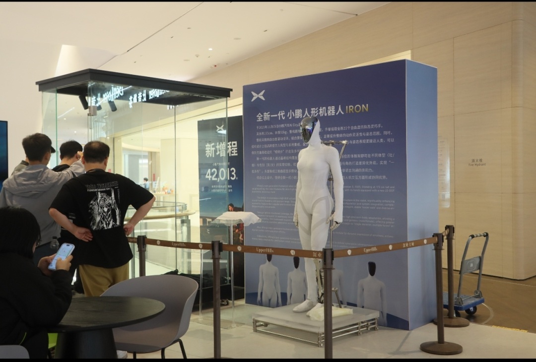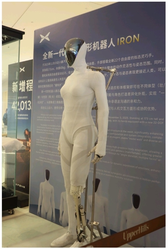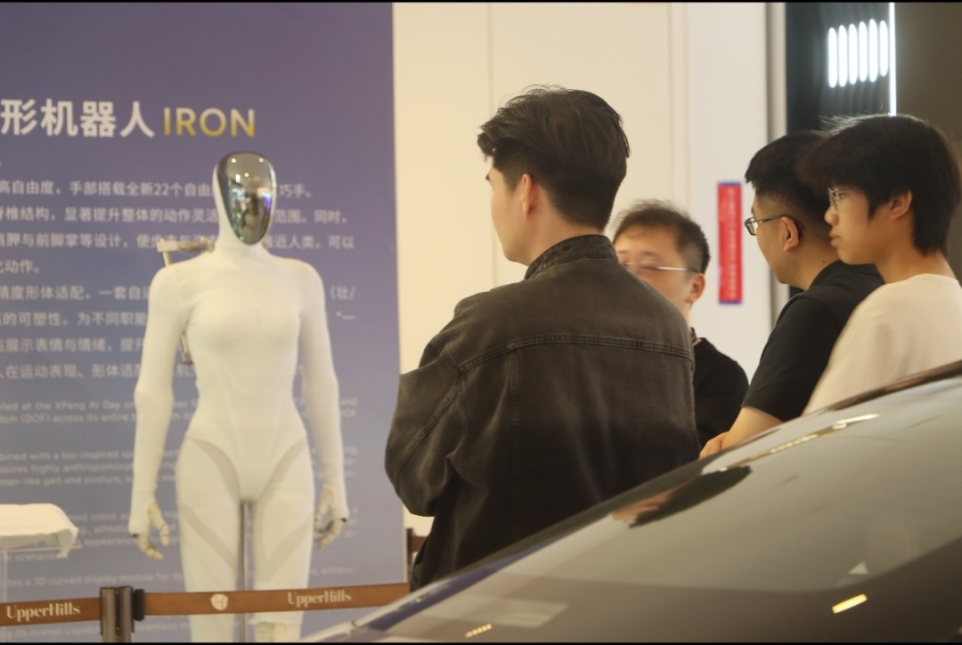 据悉,IRON机器人身高173厘米,体重65公斤,以其高度拟人的形态和灵活的运动能力为核心亮点。它全身拥有82个超高自由度关节,尤其是配备了22个自由度的拟人灵巧手,能够完成精细的抓取和操作任务。此次在深业上城商场L2层西侧中岛区域的展示,吸引了大量科技爱好者、市民及行业人士驻足观看。