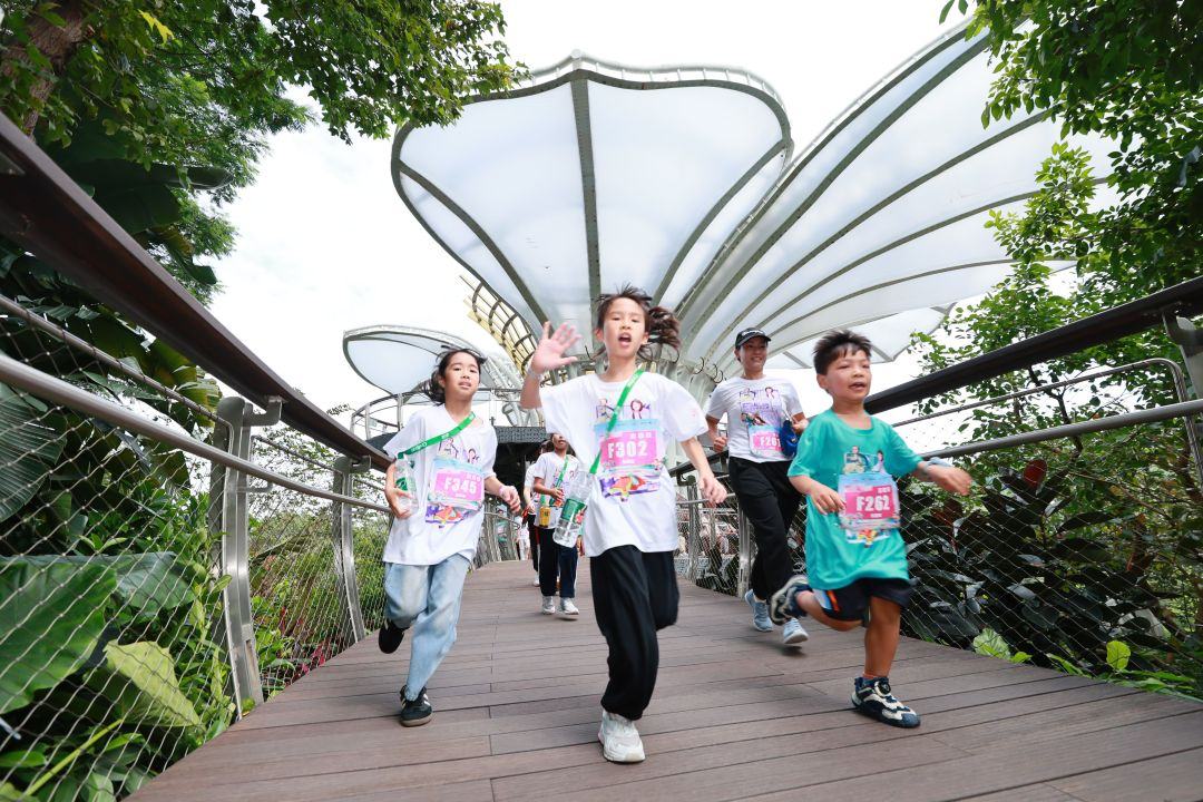 随着鸣笛声响起,在漫跑大使们的领跑下,亲子组参赛选手浩浩荡荡出发,正式闯入“云山叠翠”的诗意画卷中。首站赛道串联起云萝植物园与云台花园,堪称广州秋冬最美的“氧吧赛道”。云萝植物园,木棉道两侧的树木枝叶交错,阳光透过缝隙洒下斑驳光影,沿途的湖泊栈道旁,偶尔有白鹭掠过水面,清脆的鸟鸣与选手们的脚步声交织,惬意又治愈。转入云台花园,罗马柱廊映着斑斓花境,花瓣随风落在跑道上,成了天然的装饰。