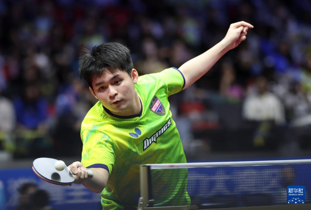 11月16日,海南队选手林诗栋在比赛中回球。图/新华社