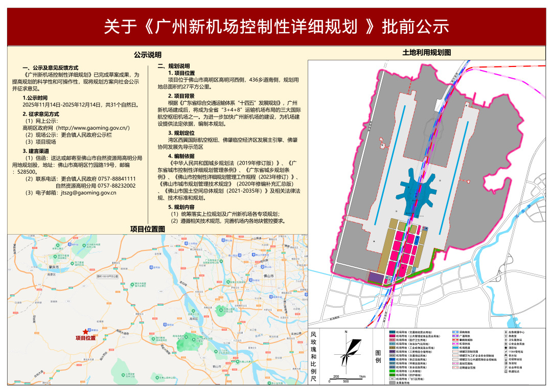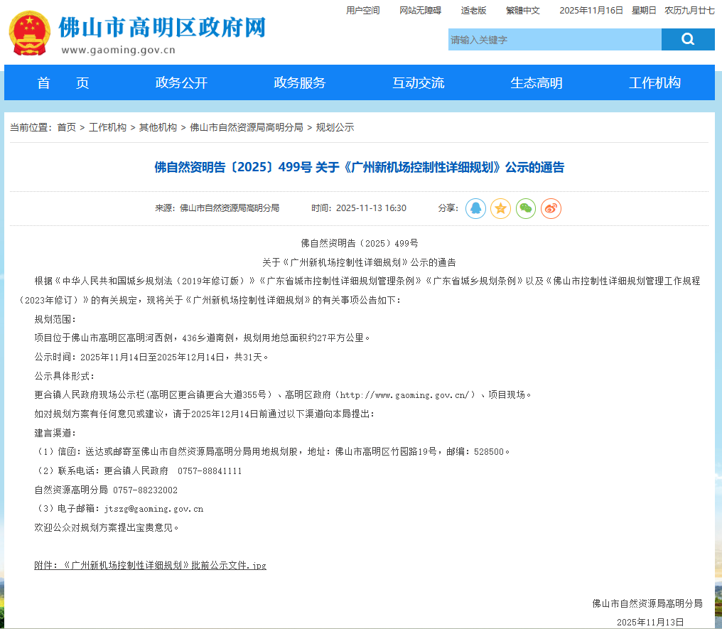 11月16日,记者从佛山市高明区获悉,根据《中华人民共和国城乡规划法》及省、市相关法规与管理规定,《广州新机场控制性详细规划》(以下简称《规划》)已于近日公示。