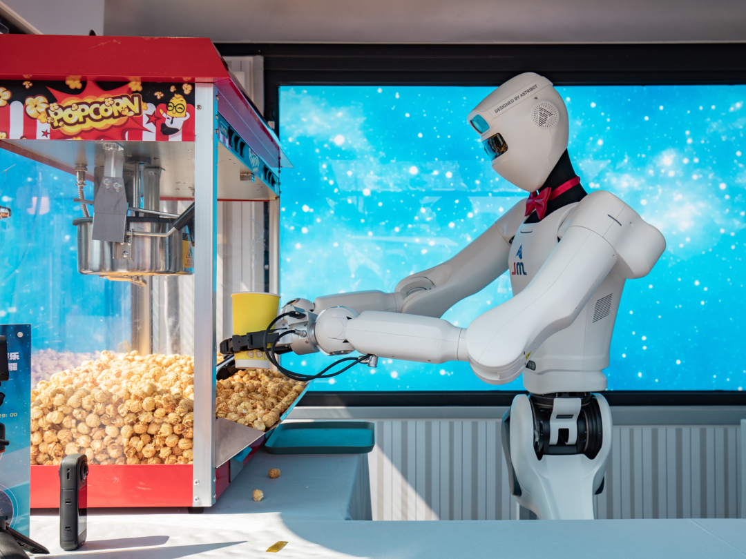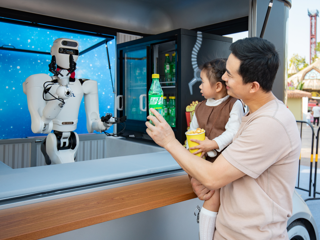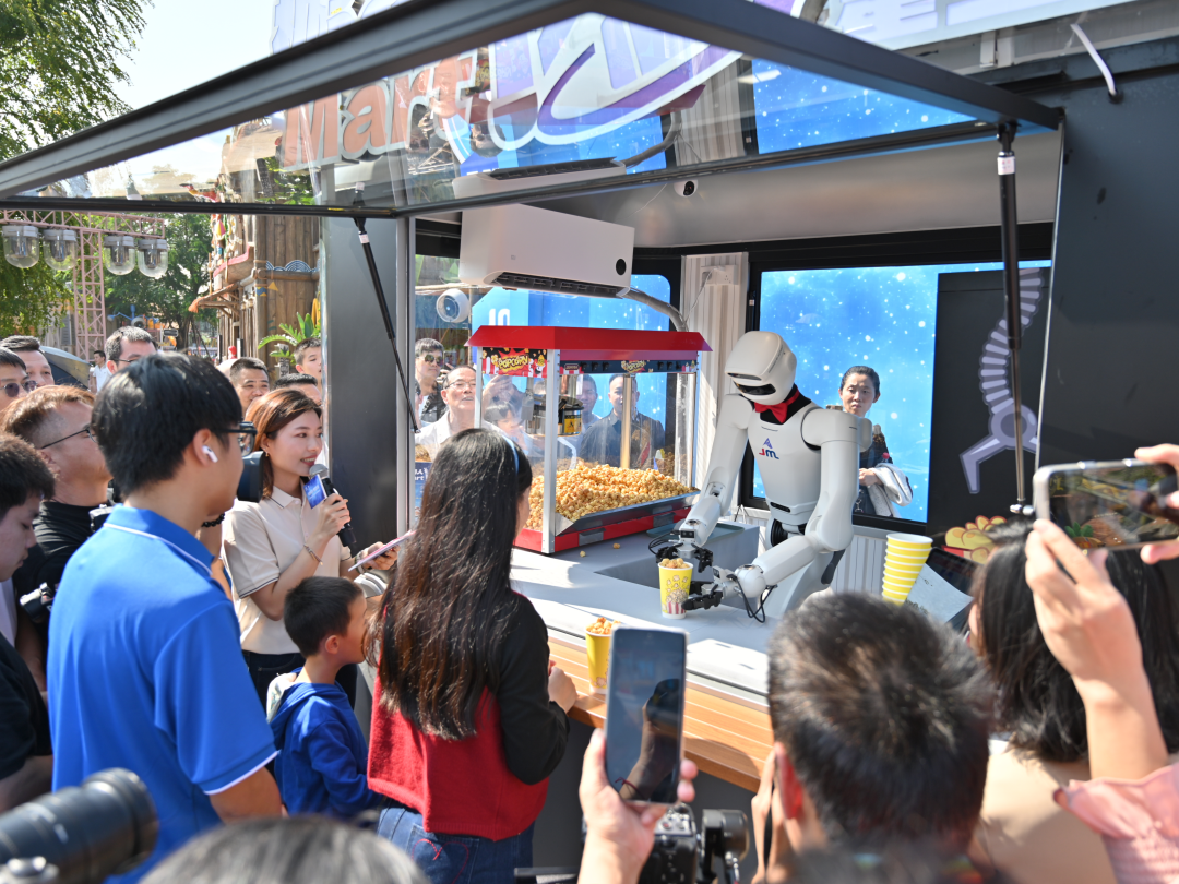 在中山时光奇遇游乐园现场,“机器人MART”里最忙碌的“店员”是一位AI主理人,它能流畅地与顾客互动,独立完成从语音接待、下单支付、精准铲放爆米花、抓取饮料、商品递送等一系列复杂操作。