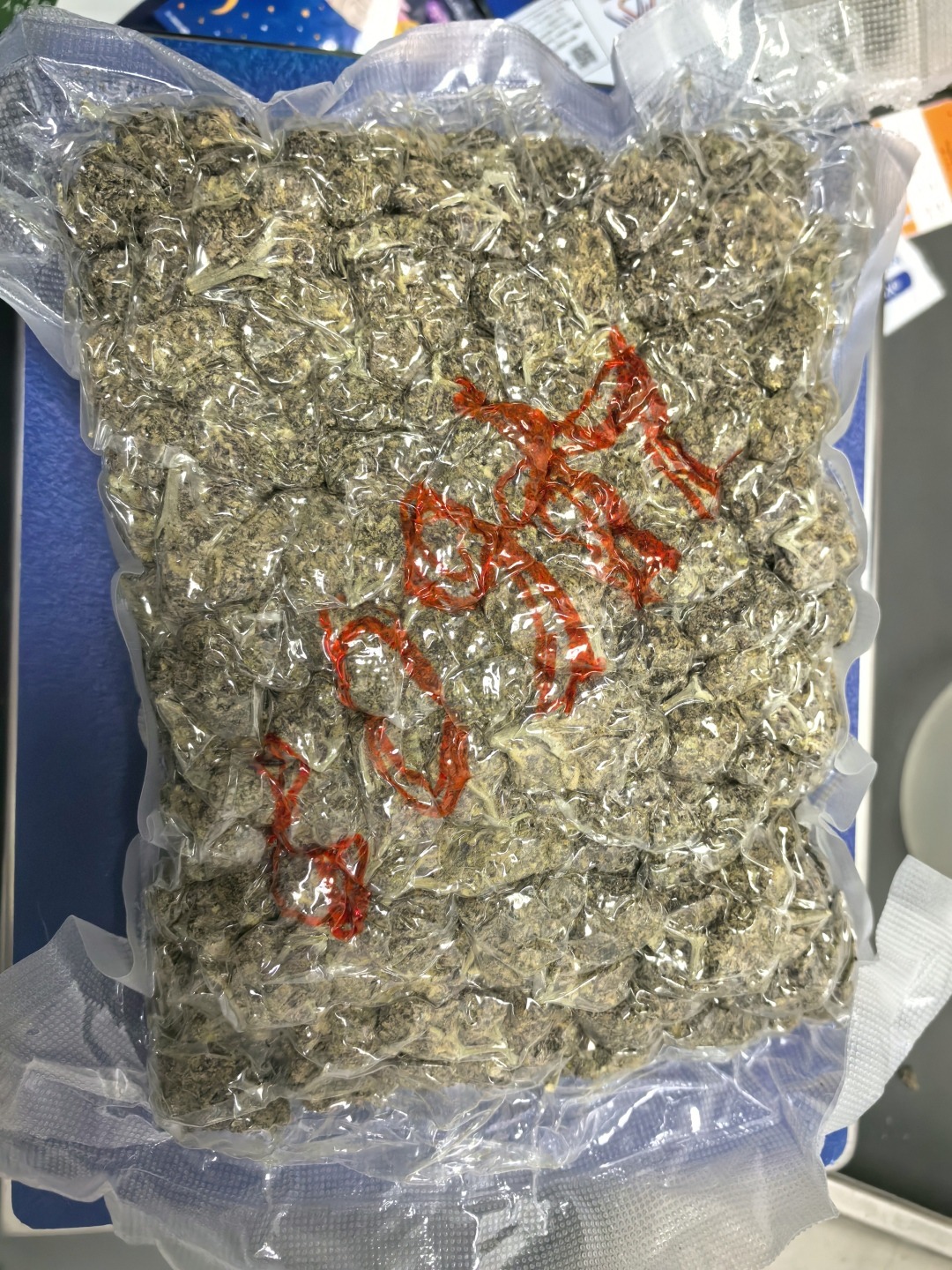 广州海关所属广州白云机场海关关员在对一架进境航班进行监管时,发现一名旅客携带的行李过机图像异常。海关关员随即拦截并进一步查验,在其行李箱及手提袋内发现多盒包装完好的零食。拆开包装后,发现内为真空密封包装的绿色团状植物,伴有强烈的刺鼻气味,现场试剂检测呈大麻阳性反应。经送技术机构鉴定,确认为大麻,重3735克。