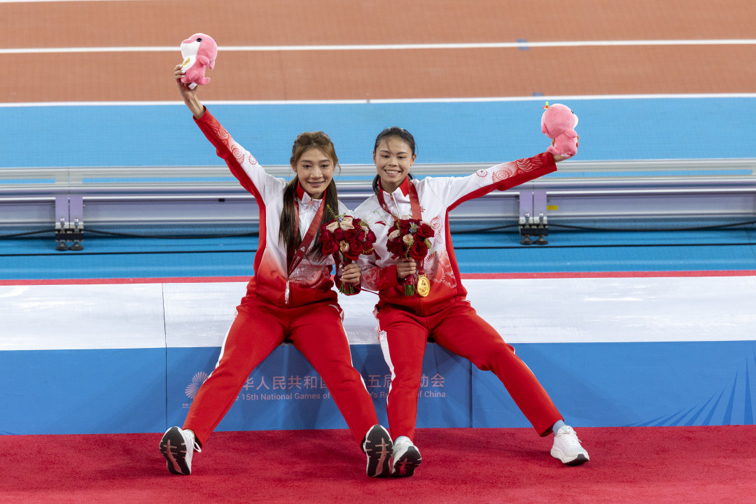 女子400米栏颁奖仪式,广东队莫家蝶(右),孔莹蓥(左)包办金银。