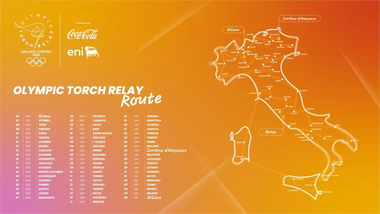 当地时间11月17日,2026米兰-科尔蒂纳丹佩佐冬奥会组委会正式公布了奥运火炬传递的完整路线。根据安排,圣火将在2025年12月6日至2026年2月6日的两个月时间里,沿着一条总长约12000公里的路线,穿越意大利全部20个大区、110个省份,并途经多处世界文化遗产与地标性景观。