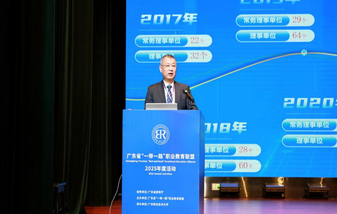 广东省“一带一路”职业教育联盟理事长、广东轻工职业技术大学校长杨欣斌作职教联盟2025年度工作报告,工作报告系统总结了一年来职教联盟在推动职教国际交流、标准输出、资源共建等方面取得的丰硕成果,明确了未来发展的核心方向与重点任务。