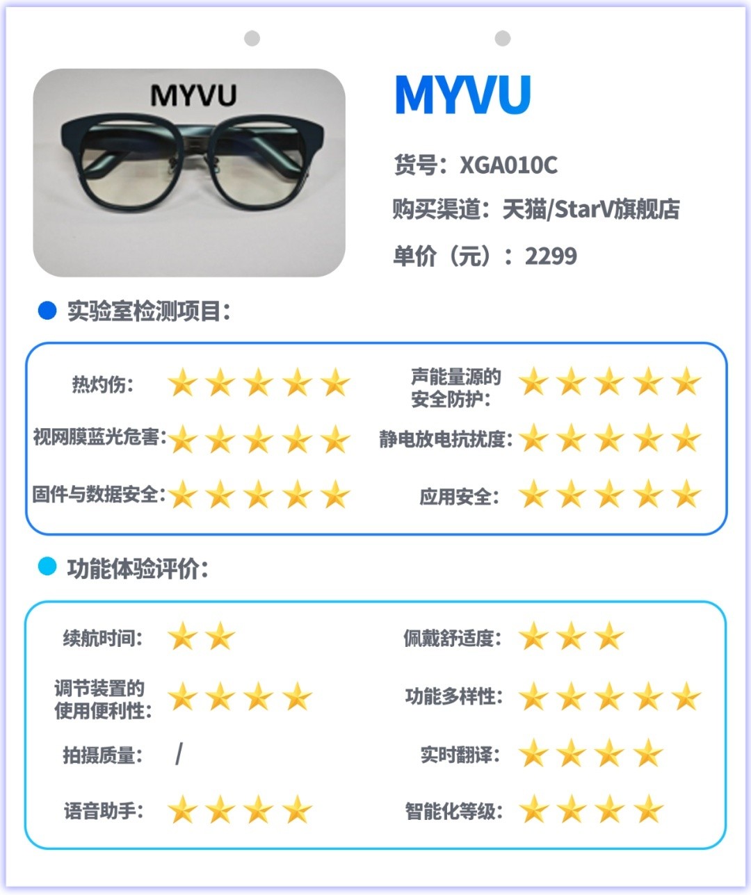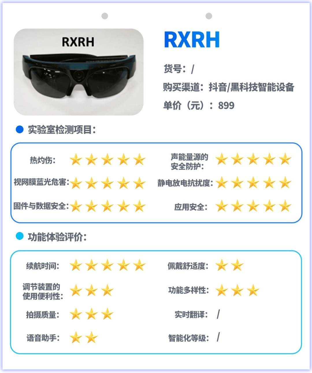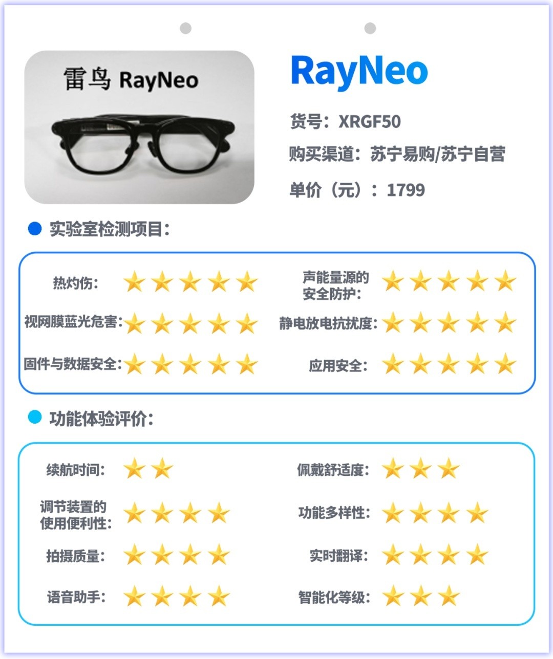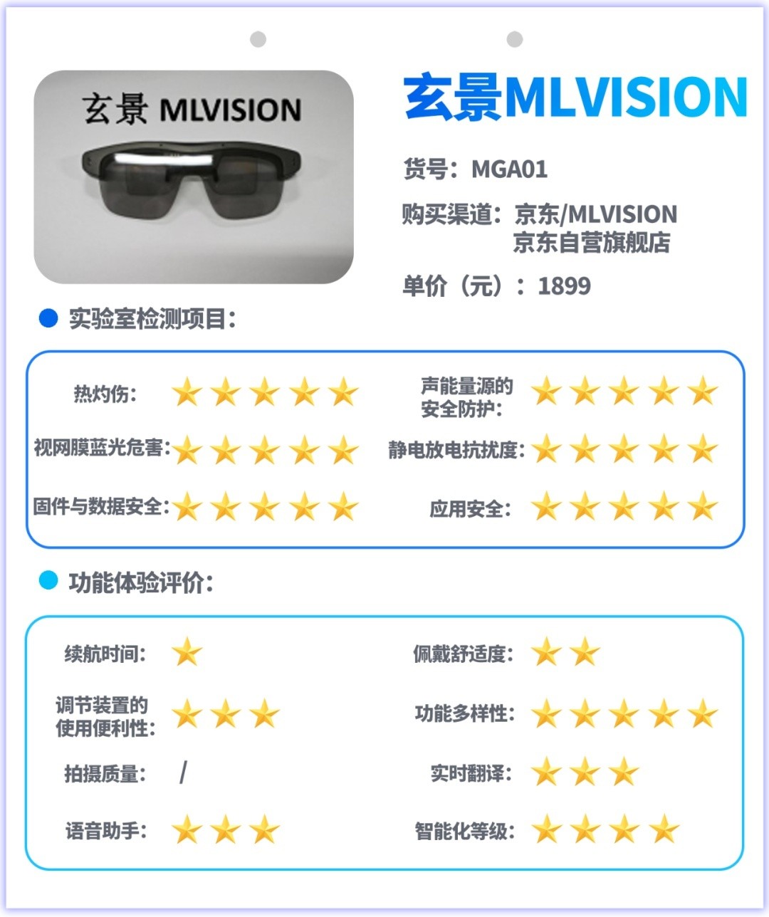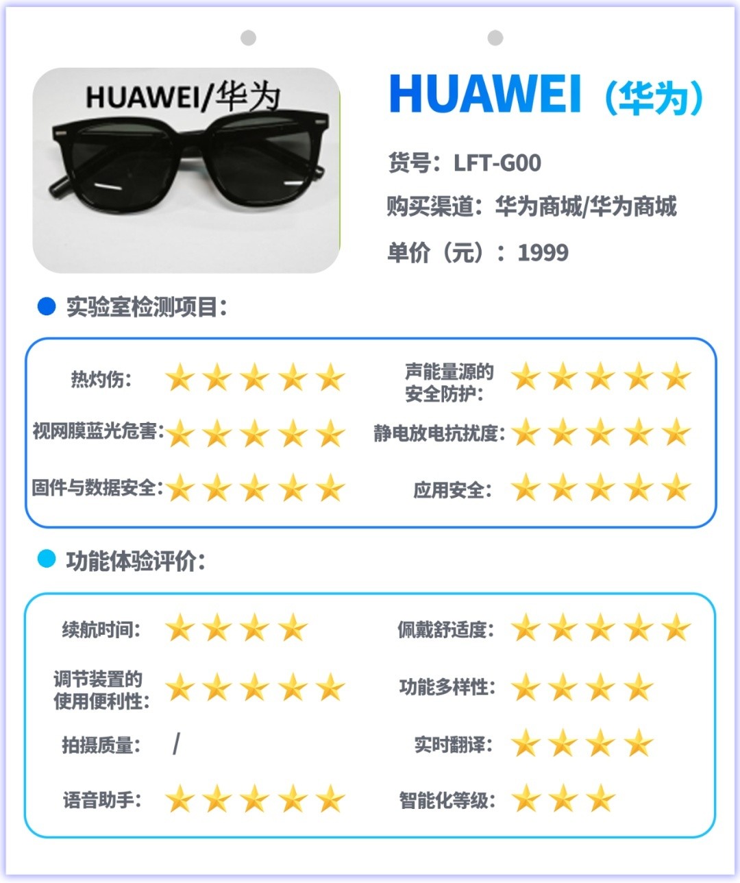 试验主要采用实验室检测和功能体验评价相结合的方式开展,实验室检测是对样品的热灼伤、声能量源的安全防护、视网膜蓝光危害、静电放电抗扰度、信息安全等指标进行测试,功能体验评价是对消费者关注的续航、佩戴舒适度、按钮或其他调节装置的使用便利性、功能多样性、拍摄图像质量、实时翻译功能、语音助手功能、智能化等级等指标和功能进行测试与体验评价。