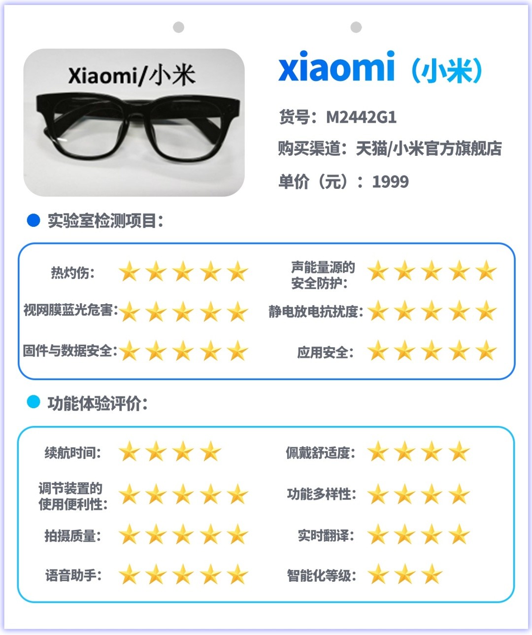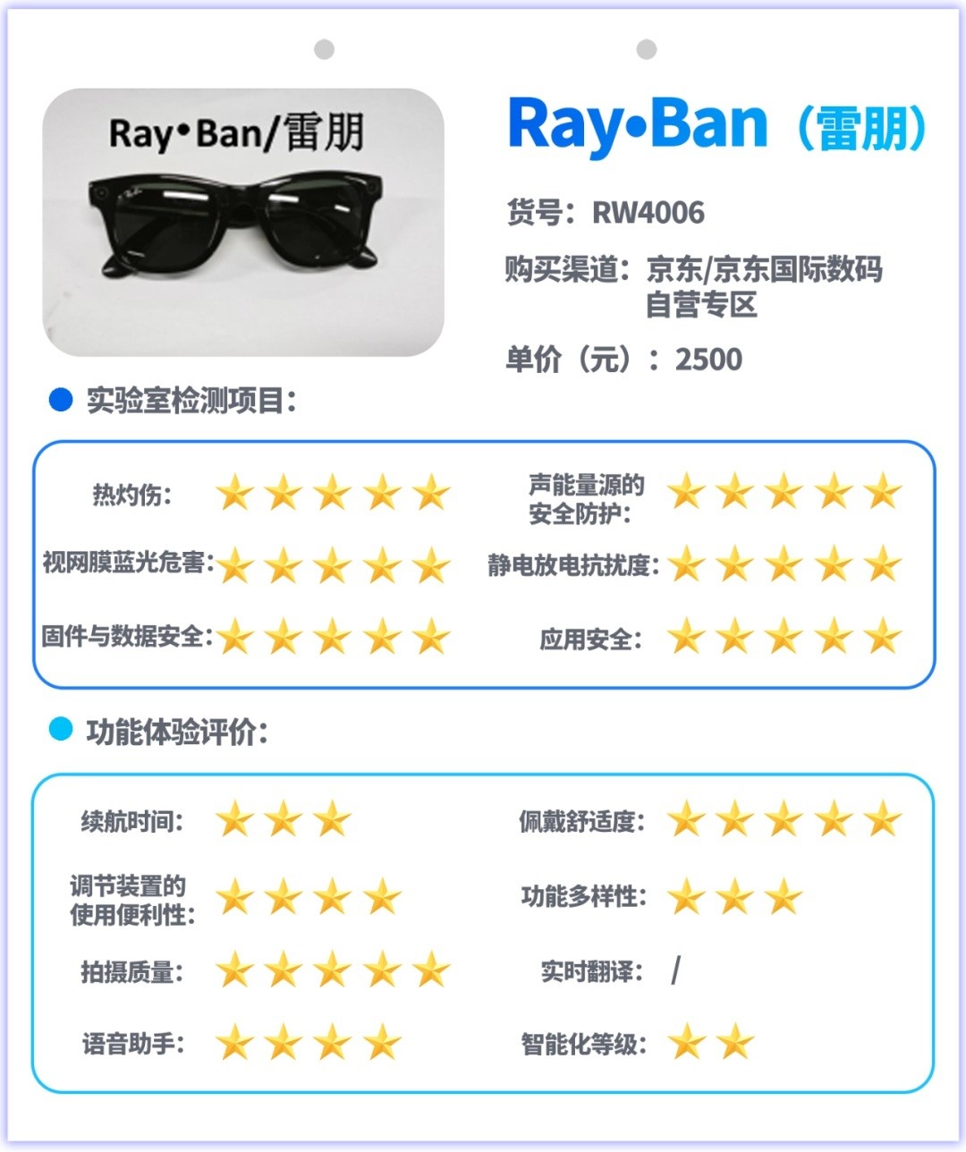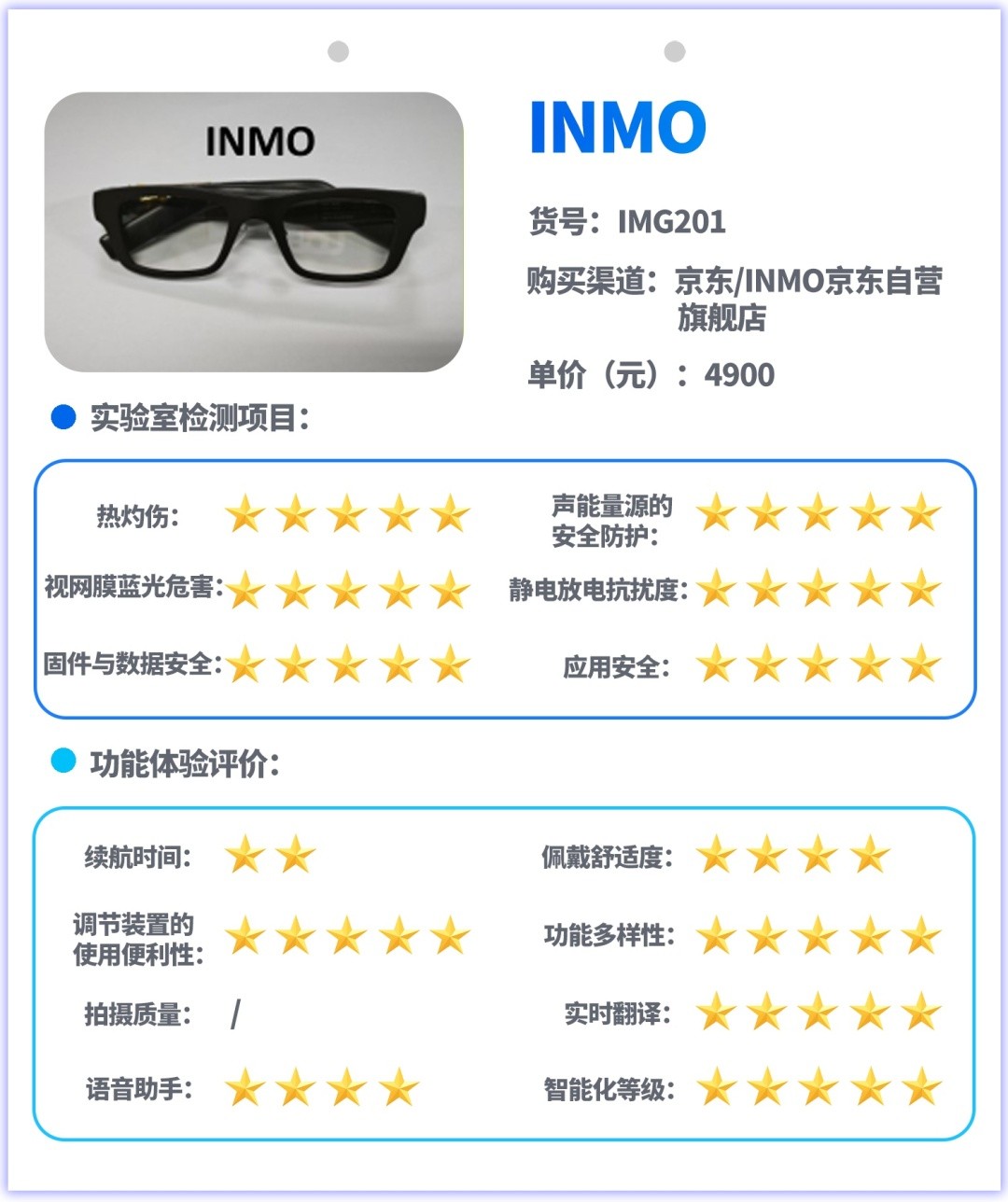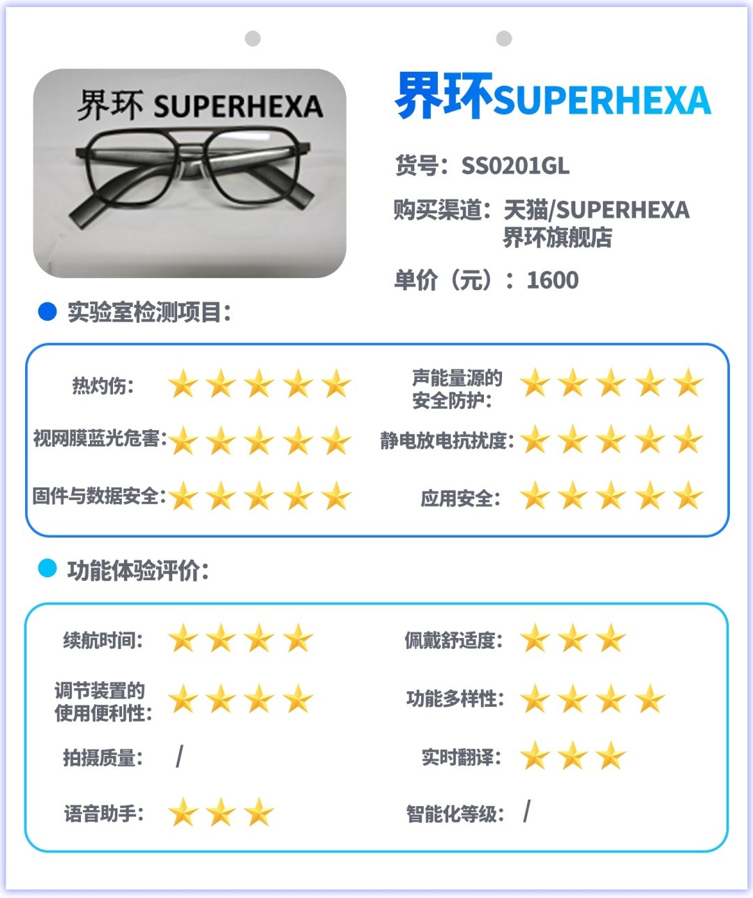 试验主要采用实验室检测和功能体验评价相结合的方式开展,实验室检测是对样品的热灼伤、声能量源的安全防护、视网膜蓝光危害、静电放电抗扰度、信息安全等指标进行测试,功能体验评价是对消费者关注的续航、佩戴舒适度、按钮或其他调节装置的使用便利性、功能多样性、拍摄图像质量、实时翻译功能、语音助手功能、智能化等级等指标和功能进行测试与体验评价。