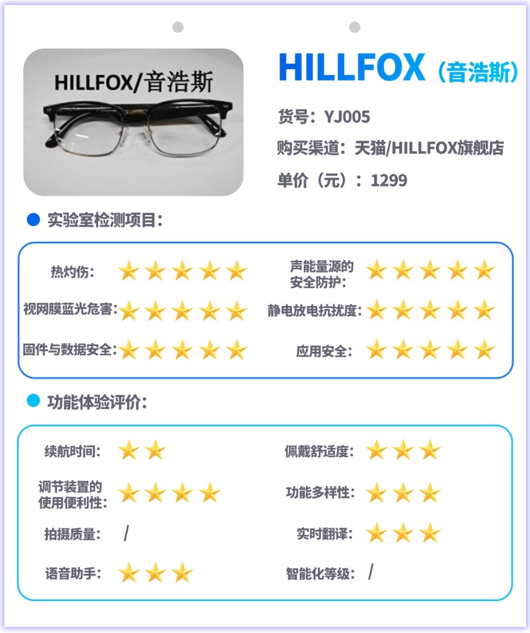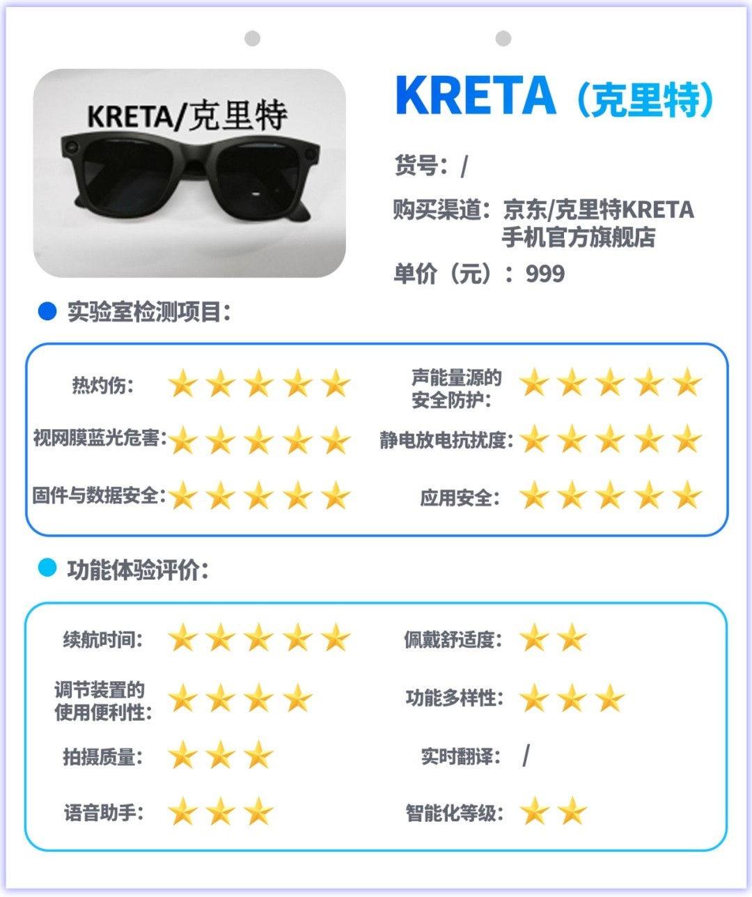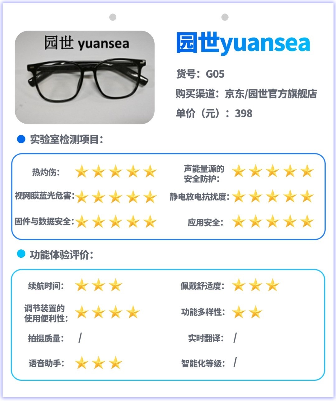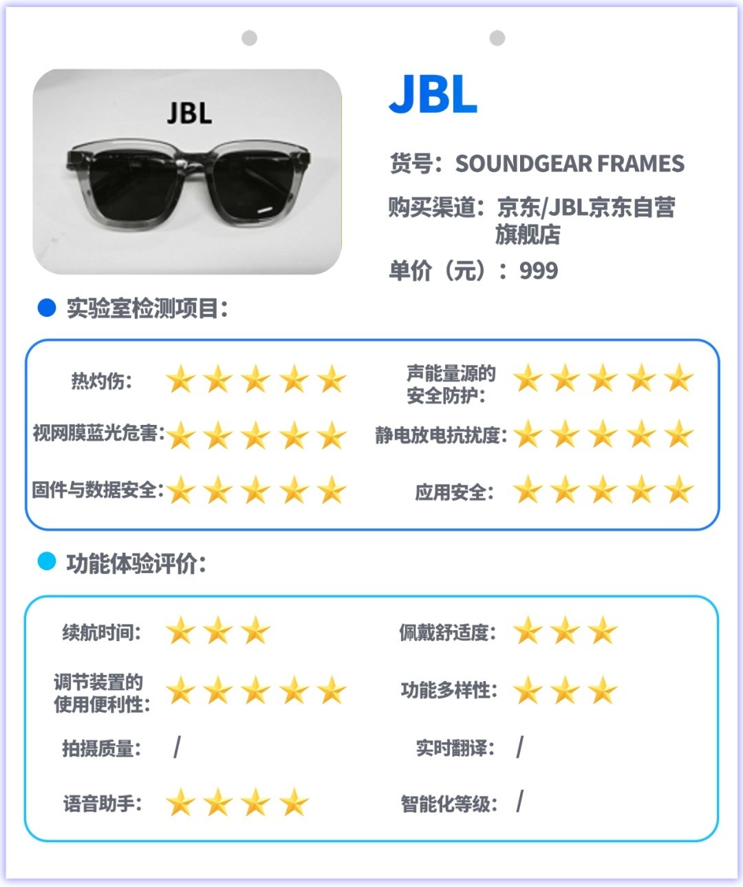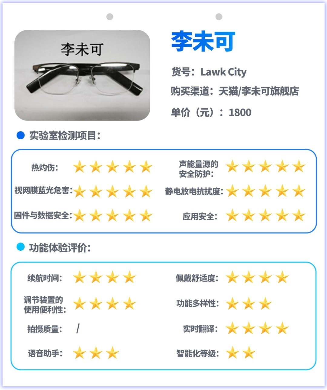 试验主要采用实验室检测和功能体验评价相结合的方式开展,实验室检测是对样品的热灼伤、声能量源的安全防护、视网膜蓝光危害、静电放电抗扰度、信息安全等指标进行测试,功能体验评价是对消费者关注的续航、佩戴舒适度、按钮或其他调节装置的使用便利性、功能多样性、拍摄图像质量、实时翻译功能、语音助手功能、智能化等级等指标和功能进行测试与体验评价。
