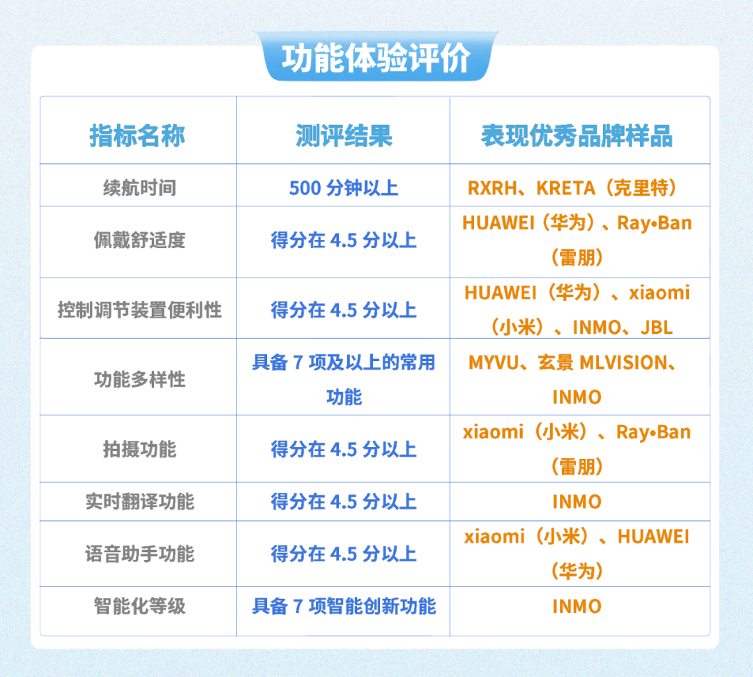 在功能体验评价方面,15款样品的续航时间在97分钟到673分钟之间,其中RXRH、KRETA(克里特)品牌的样品续航时间在500分钟以上,表现优秀。HUAWEI(华为)、Ray·Ban(雷朋)品牌的样品佩戴舒适度表现优秀;HUAWEI(华为)、xiaomi(小米)、INMO、JBL品牌的样品控制调节装置便利性表现优秀。MYVU、玄景MLVISION、INMO品牌的样品具备7项及以上的常用功能,功能多样性表现优秀;xiaomi(小米)、Ray·Ban(雷朋)品牌的样品拍摄功能表现优秀;INMO品牌的样品实时翻译功能表现优秀;xiaomi(小米)、HUAWEI(华为)品牌的样品语音助手功能表现优秀;INMO品牌的样品具备7项智能创新功能,智能化等级较高,表现优秀。