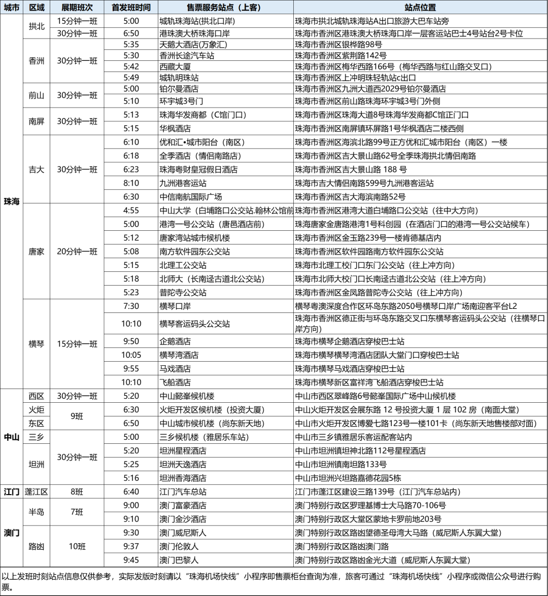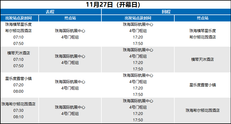 11月27—30日,珠海机场快线新增航展中心4号门停靠点,市内增开拱北、香洲、吉大、前山、横琴、南屏、唐家至航展中心4号门的往返班次,同时新增中山、江门、澳门等跨市往返线路。