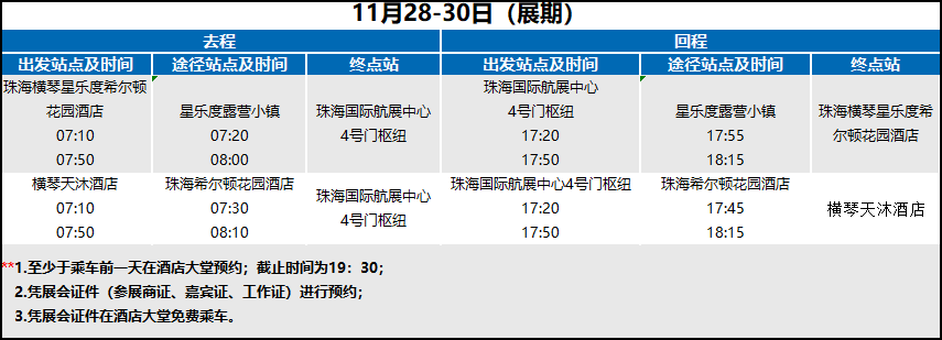 另外,展会主办方还贴心地为入住指定接待酒店的展商、嘉宾安排了酒店免费穿梭巴士,展商、嘉宾可凭展会证件在指定接待酒店前台登记预约,乘坐酒店免费穿梭巴士往返航展中心4号门。