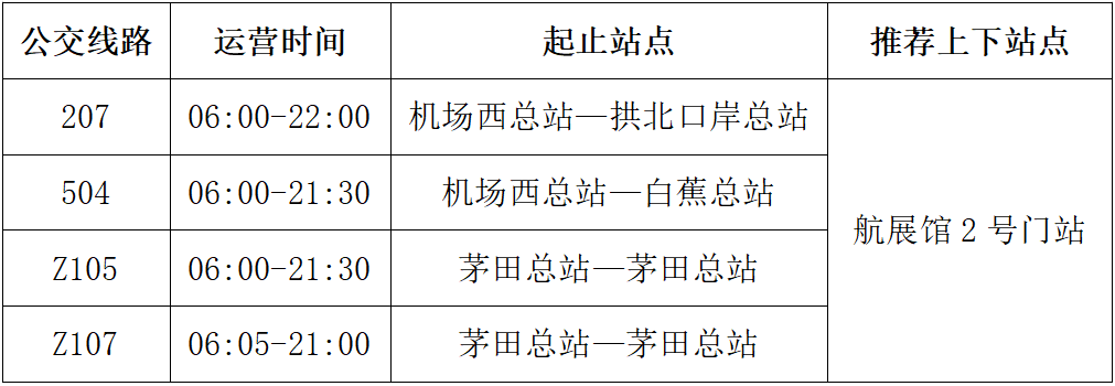需要乘坐公交车的观众,请关注“珠海公交巴士”微信号查询线路,可乘坐207、504、Z105、Z107路公交车抵达“航展馆2号门”站,请合理规划换乘路线。