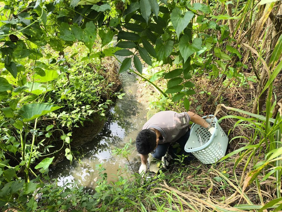 近日,有群众反映佛冈县石角镇某养殖场存在废水外排情况。接到举报后,清远市生态环境局佛冈分局立即组织执法人员赴现场核查。经查,该养殖场废水处理塘外排口存在废水外排问题,执法人员当场依法固定证据,并委托执法监测机构对外排废水进行采样分析。