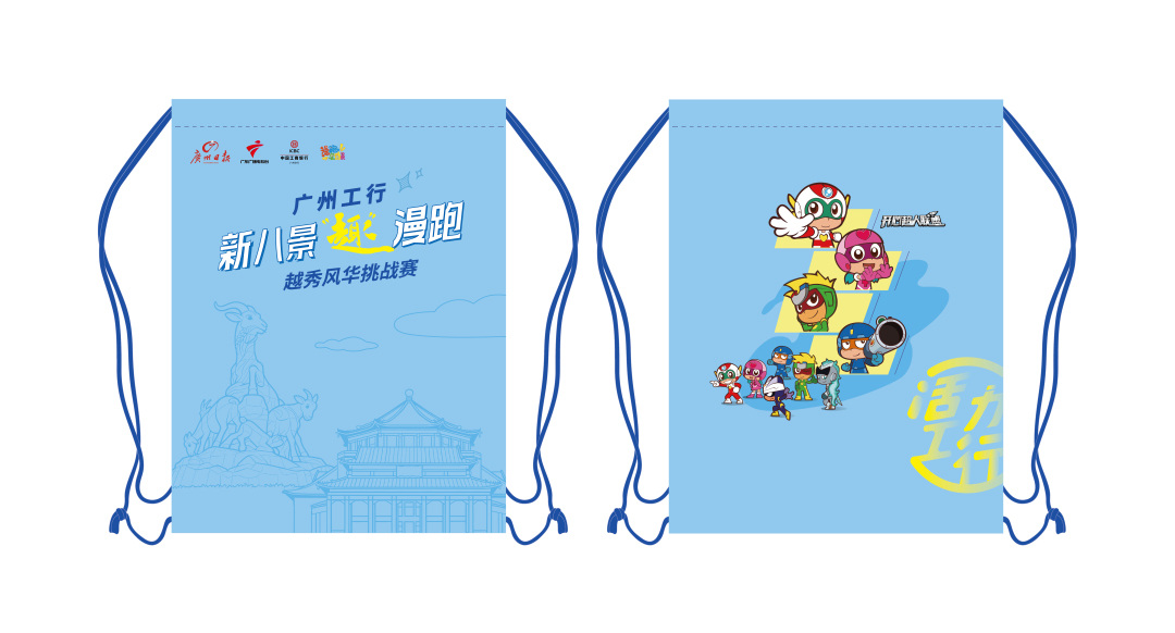 清新的浅蓝色调搭配专属设计,参赛包两面都有小心思。一面印着“广州工行·新八景趣漫跑越秀风华挑战赛”主题字样,还融入了五羊雕像、中山纪念堂等越秀地标线稿,把“越秀风华”的文化底蕴直接背在身上;另一面则是开心超人联盟全员集结的萌趣形象,搭配“活力工行”的醒目字样,可爱值直接拉满,不管是装参赛物资还是日常户外运动,都是吸睛又实用的运动单品!
