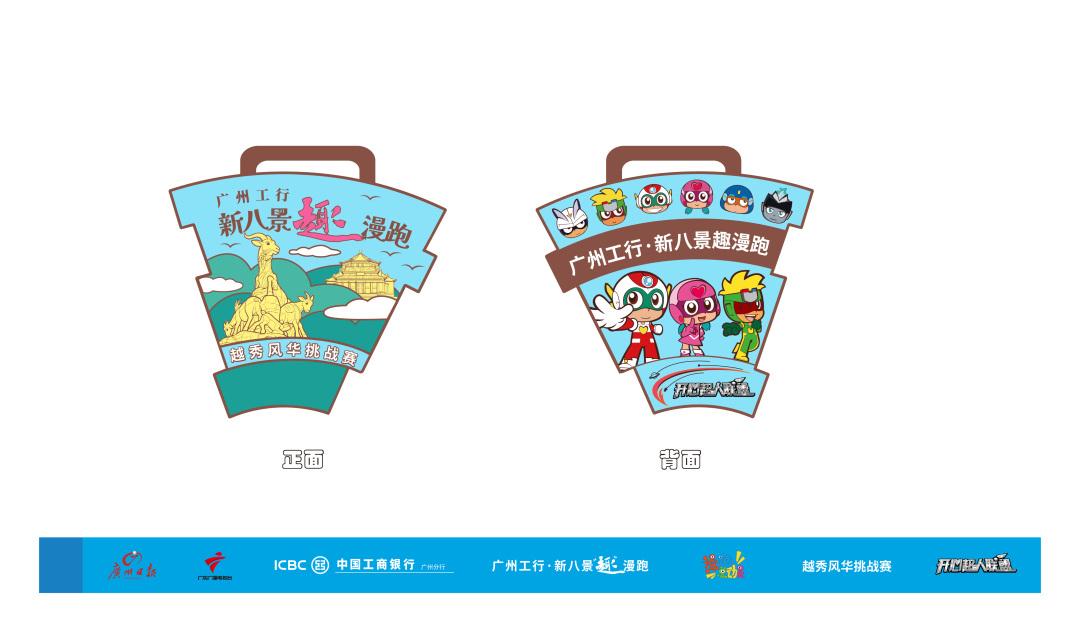 颜值与内涵双在线!正面印着“广州工行·新八景趣漫跑越秀风华挑战赛”字样,搭配五羊雕塑、中山纪念堂风光,质感十足;背面清晰镌刻赛事信息与开心超人联盟元素,萌趣感拉满。