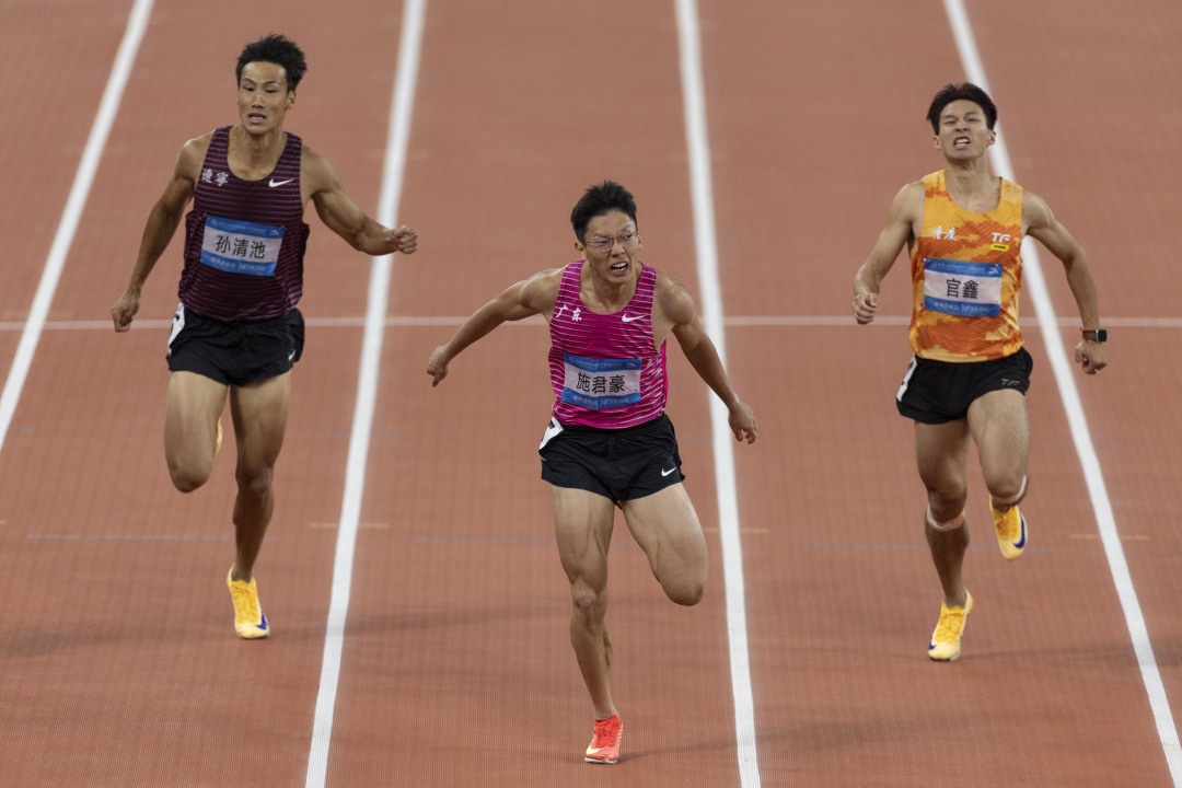 十五运会田径比赛今天在广东奥体中心迎来最后一个比赛日,在男子4x100米接力项目决赛广东队派出苏炳添、刘洪熙、施君豪、陈冠锋,以38秒71获得第四名,遗憾地与奖牌擦肩而过。在本届全运会上摘下男子200米金牌的21岁施君豪被苏炳添点名接棒。他表示,很荣幸陪伴苏炳添大哥完成“最后一舞”,四年后的第十六届全运会,他有信心在男子4x100米接力项目卷土重来。