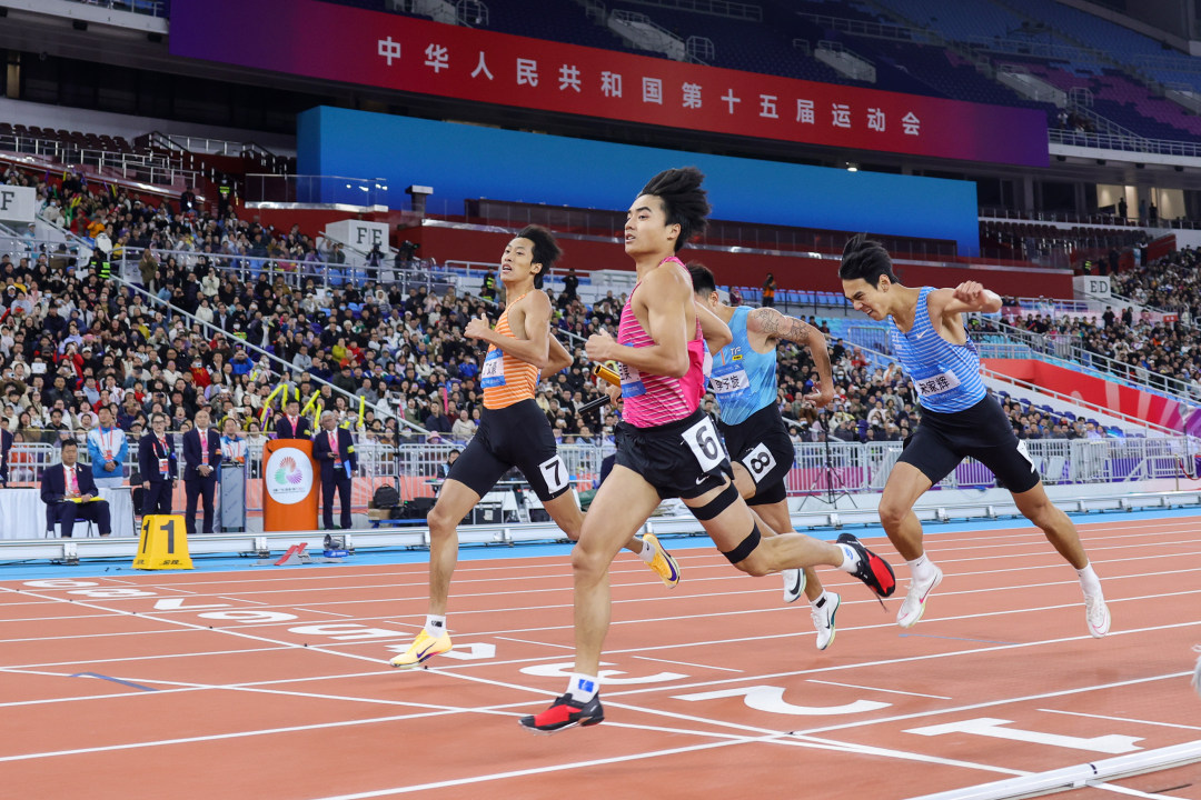 男子4x400米接力预赛,广东选手梁宝棠冲刺