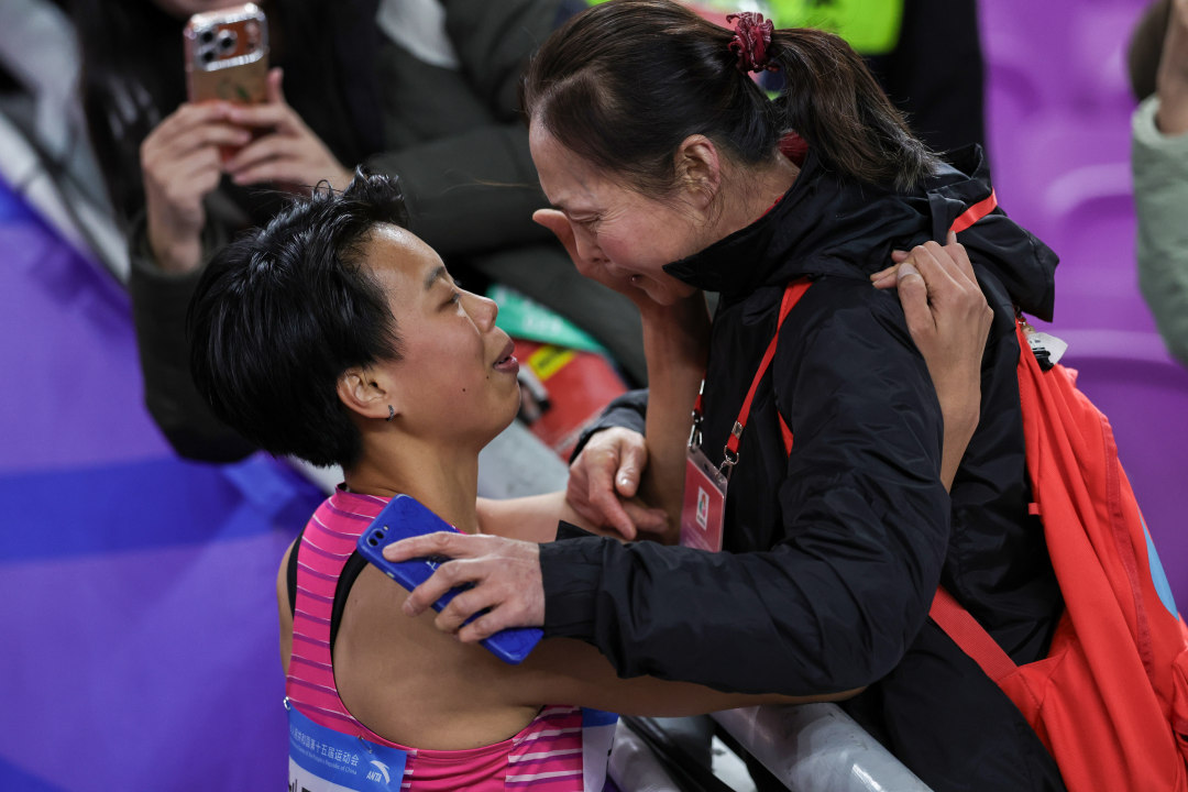 广东队选手刘景扬夺得十五运会田径项目女子100米栏金牌。赛后,与妈妈相拥而泣