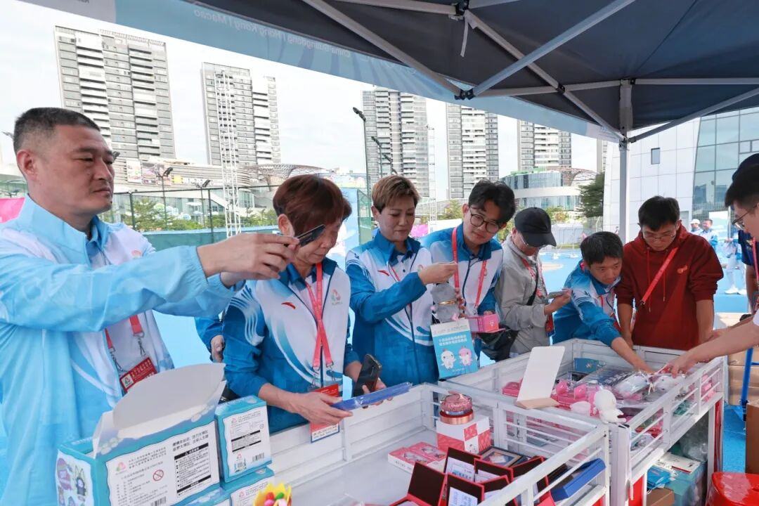 结束比赛的选手都放下了紧张的心情,在赛场旁的全运会特许商品零售店挑选着中意的商品。