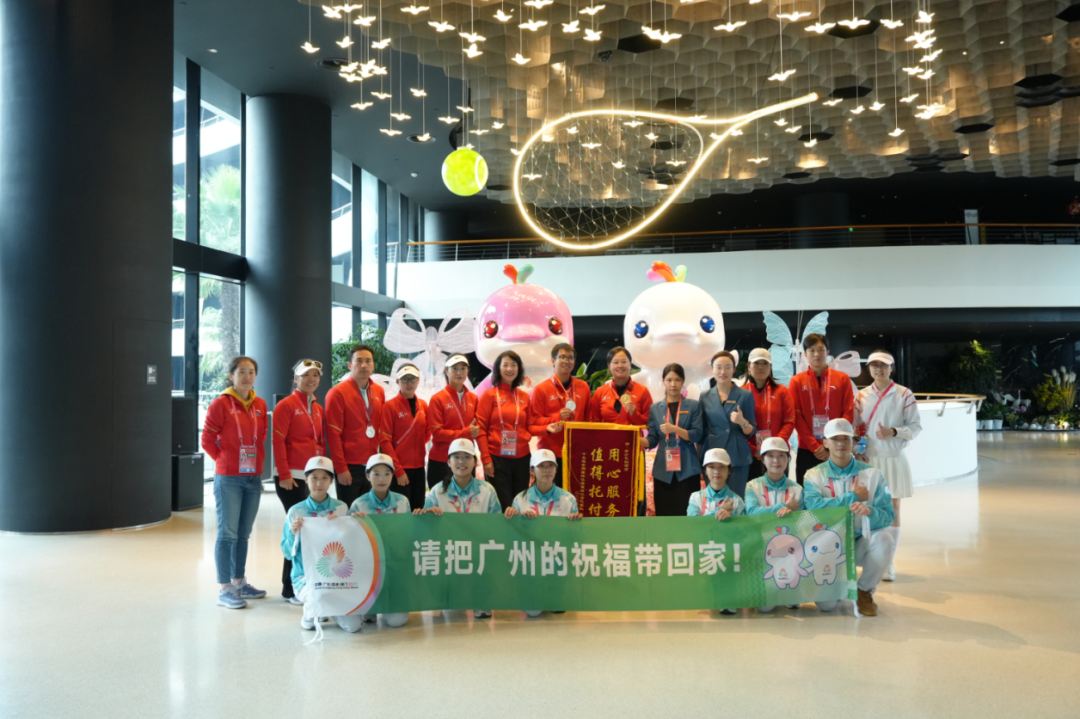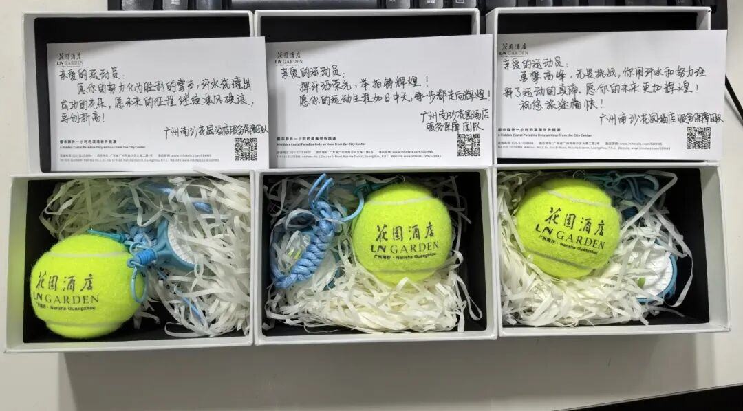 南沙花园酒店圆满完成了对十五运会群众比赛网球项目参赛队伍的接待任务,今天欢送香港队、河北队、陕西队等共计118名运动员离店。为表达祝福与纪念,酒店特别为每位离店运动员精心准备了一份小礼物——一枚印有酒店LOGO的网球造型钥匙扣,寓意“网”住美好回忆。