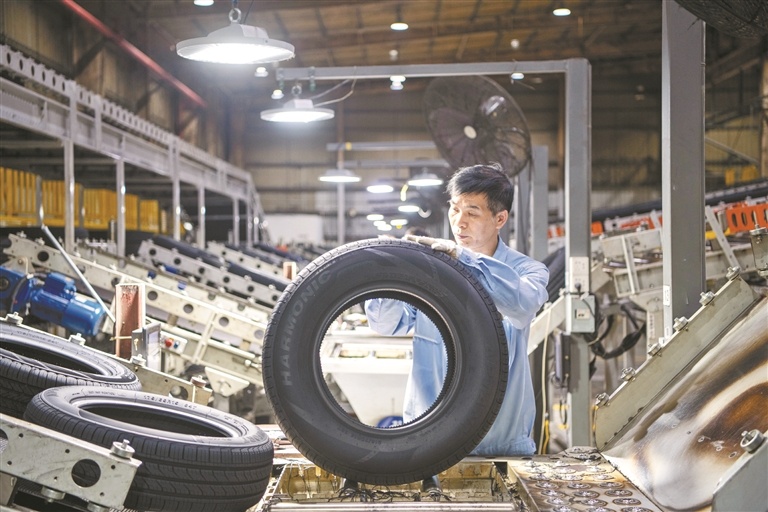 在万力轮胎的生产车间,工作人员正在检查轮胎成品。(资料图片)
