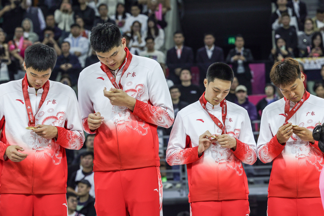 11月12日晚,十五运会篮球男子成年组决赛,广东队时隔十二年后,再次站上全运会最高领奖台,队史第三次夺得全运会男篮冠军。颁奖台上广东队赵睿、胡明轩等球员仔细端详金牌。