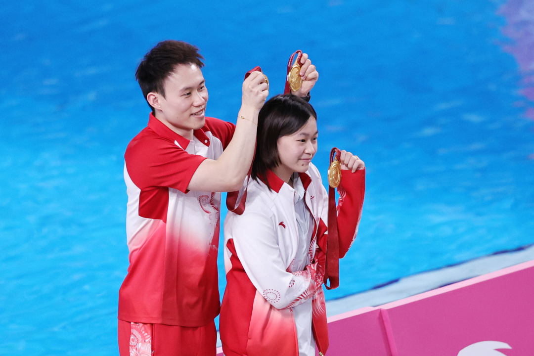 11月11日,十五运会跳水项目迎来收官日,女子3米跳板决赛结束后,全红婵和谢思埸持金牌在馆内合影。