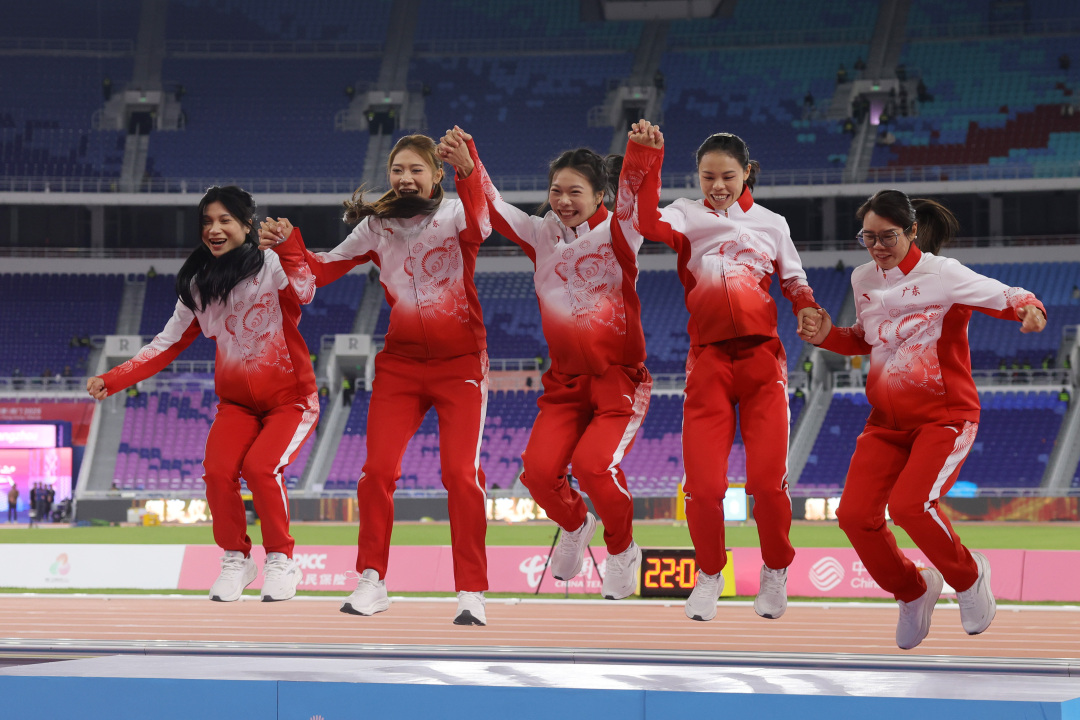 11月20日,广东队夺得十五运会女子4x400米接力金牌,颁奖仪式上,广东队队员与教练欢快蹦上领奖台。