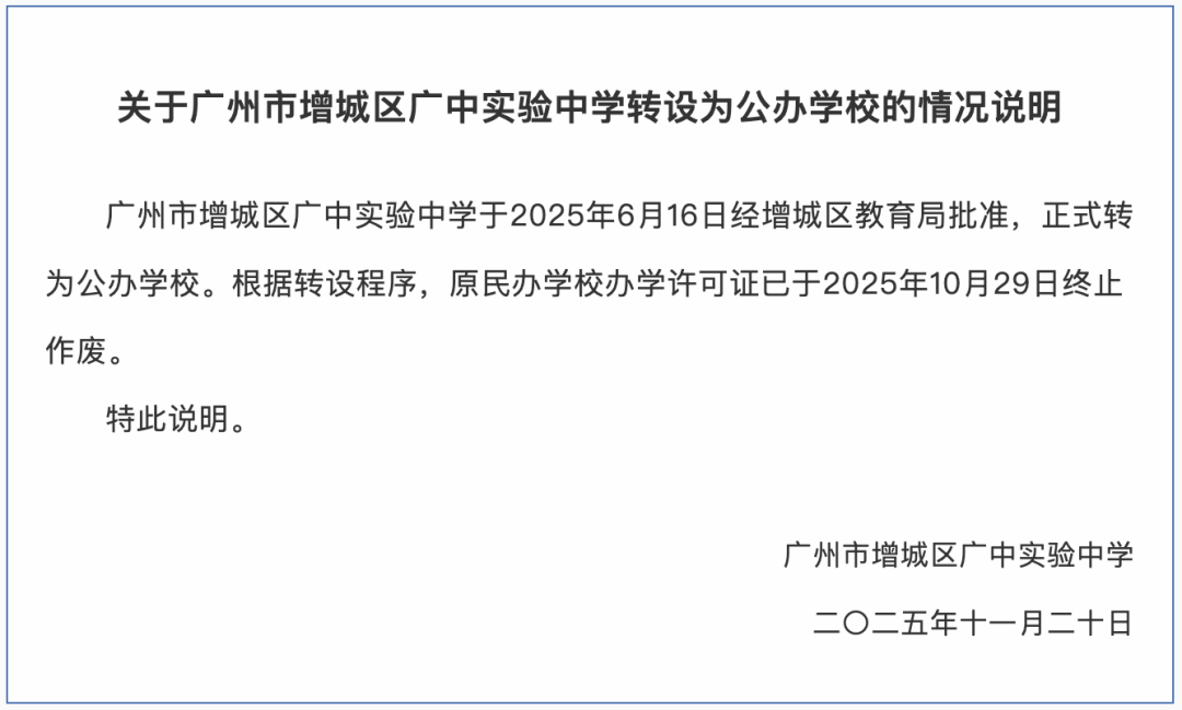 11月20日,广州市增城区广中实验中学发布《关于广州市增城区广中实验中学转设为公办学校的情况说明》(以下简称《说明》)。