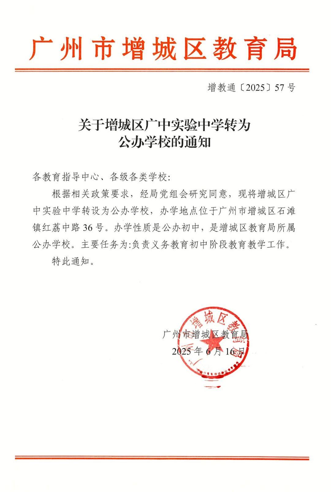 《说明》显示,广州市增城区广中实验中学于2025年6月16日正式转为公办学校。转公后,学校办学性质为公办初中,是增城区教育局所属公办学校,主要任务是负责义务教育初中阶段教育教学工作。