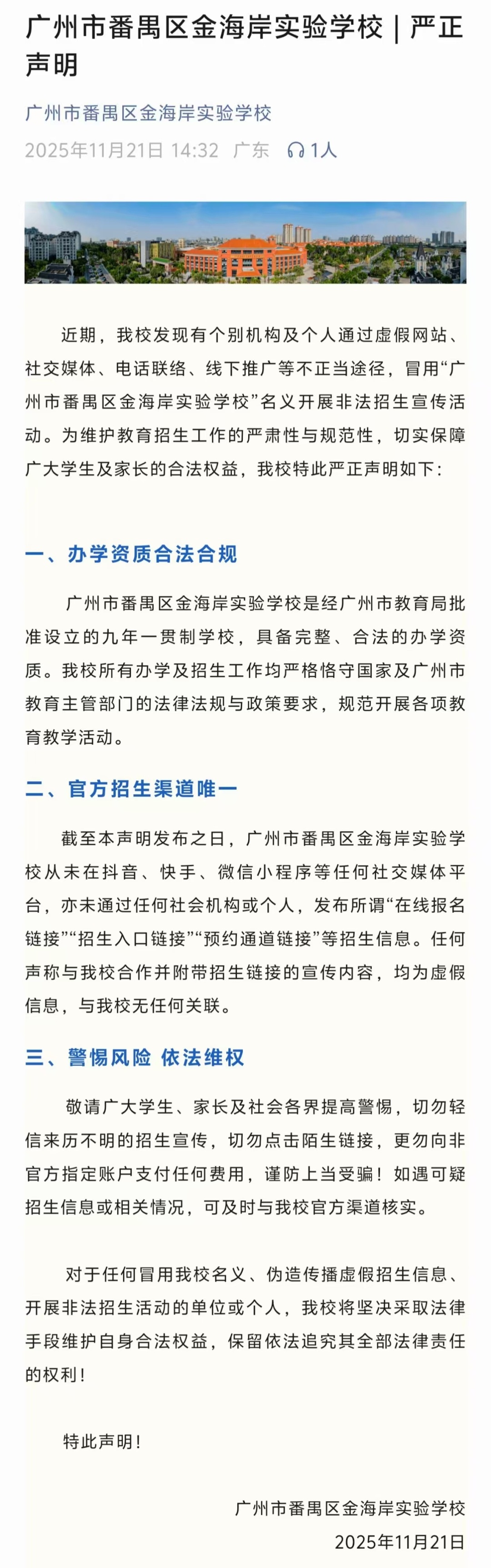 11月21日,广州市番禺区金海岸实验学校、荔湾区荔广实验学校相继发布招生相关严正声明,就冒用学校名义开展非法招生宣传、散布违规入学不实信息等问题做出明确回应。