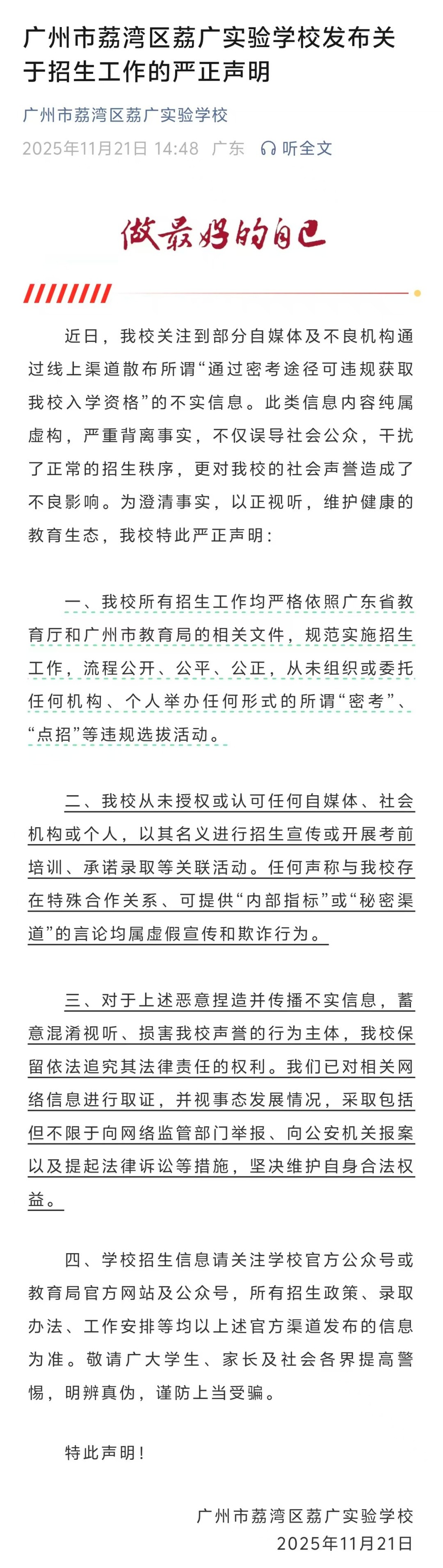 同日,荔湾区荔广实验学校也针对招生乱象发布声明。该校表示,部分自媒体及不良机构通过线上渠道散布“通过密考途径可违规获取我校入学资格”的不实信息,此类内容纯属虚构。学校强调,所有招生工作均严格依照省、市教育局相关文件规范实施,流程公开公平公正,从未组织或委托任何机构、个人举办“密考”“点招”等违规选拔活动,也未授权任何主体以学校名义开展招生宣传、考前培训或承诺录取等活动。