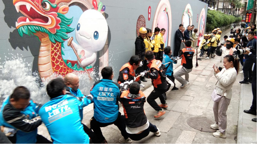 这幅墙绘的独特魅力源自于它的“共同创作”——不仅有专业画师参与,更吸纳了辖区居民和骑手的想法和建议。左边将全运会吉祥物“喜洋洋”和“乐融融”与城市风貌完美融合,右边的“好荔友”踏花而来,与小哥们飞驰在城市道路的身影相映成趣,成为驿站旁一道亮丽的风景线。