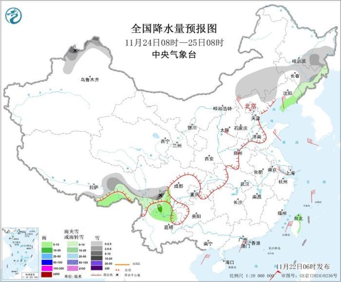11月24日08时至25日08时,新疆北疆北部、内蒙古东部、东北地区东部、西藏东部、四川西南部、云南西北部等地部分地区有小雪或雨夹雪,其中,黑龙江东南部、新疆北疆北部、西藏东部、四川西南部等地部分地区有中到大雪(5~8毫米);辽宁南部、四川南部、云南北部、西藏东南部、台湾岛东部等地部分地区有小雨,其中,四川南部局地有中雨。内蒙古中部、华北西部和北部、辽东半岛、山东半岛等地部分地区有5~6级风,局地阵风7~9级;南海中东部、东海北部有6~8级风,阵风9级,渤海、渤海海峡、黄海大部有5~7级风、阵风8级。