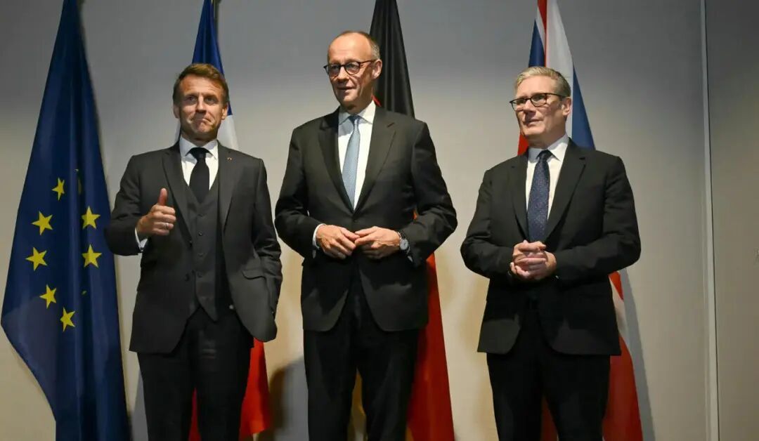 △法国总统马克龙(左)、英国首相斯塔默(右)和德国总理默茨(中)(资料图)