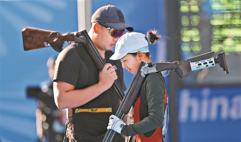 11月15日,广东队组合窦旭阳/车雨霏(右)在射击项目比赛中。 新华社发
