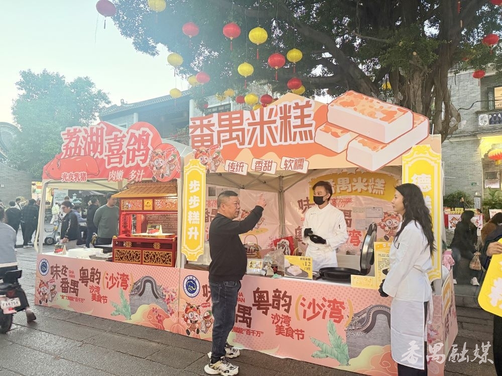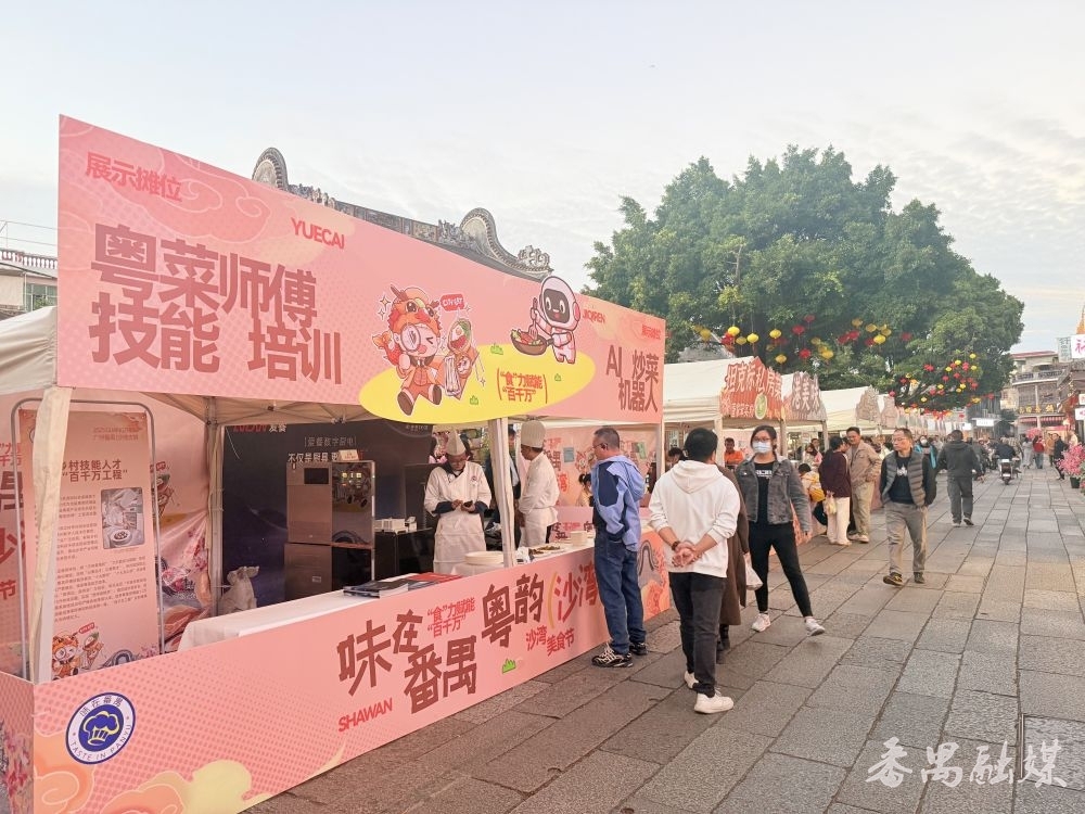 活动摊位沿街铺陈,琳琅满目的特色小吃让市民和游客纷纷驻足品尝。米糕、姜埋奶、煎酿鲮鱼、鱼皮角等传统风味排起长龙;AI炒菜机器人现场操作,让人感受到“传统味道+现代科技”的碰撞;多家手信品牌同步亮相,带来可即食、可带走的“番禺味道”。从吆喝声到翻滚的锅气,从排队取餐的笑脸到街巷间的烟火香气,美食节让800多年历史的古镇,再次焕发出独特的岭南“市井暖意”。
