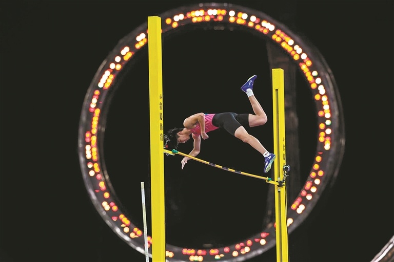 11月19日,十五运会田径男子撑竿跳高决赛,广东选手曾亮越过横杆。