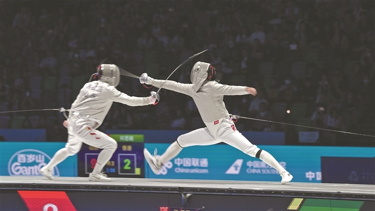 11月15日,在香港赛区举行的十五运会男子佩剑个人金牌赛中,山东队选手魏振浩(左)以15比7战胜香港队选手何思朗(右),获得冠军。