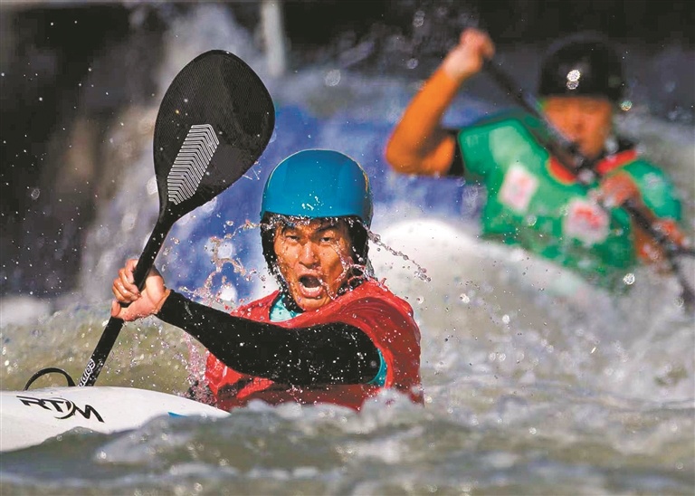 11月15日,十五运会皮划艇(激流回旋)项目决赛在白云区钟落潭举行,广东选手在比赛中奋力拼搏。