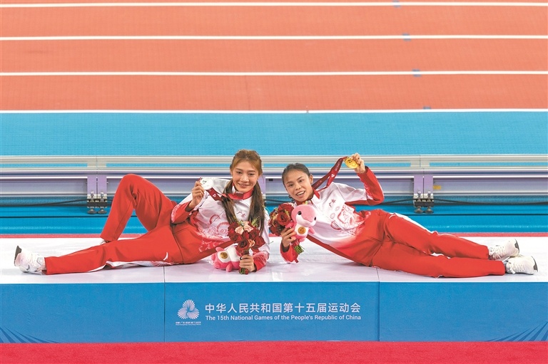 11月17日,广东队包揽十五运会田径女子400米栏决赛金银牌,冠军莫家蝶(右)和孔莹蓥在颁奖台上摆拍留念。