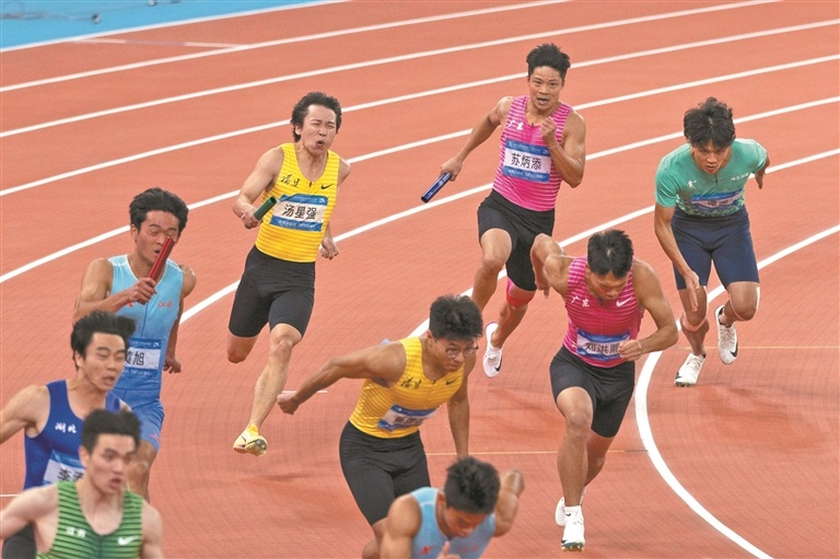 11月20日晚,十五运会田径男子4X100米决赛在广东奥体中心举行,苏炳添作为广东队第一棒选手,在弯道奔跑准备交棒,当晚也是苏炳添的谢幕战。