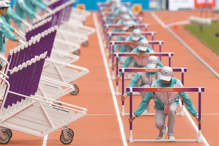 11月19日,广东奥体中心,100米跨栏预赛前,志愿者在跑道上摆放跨栏。