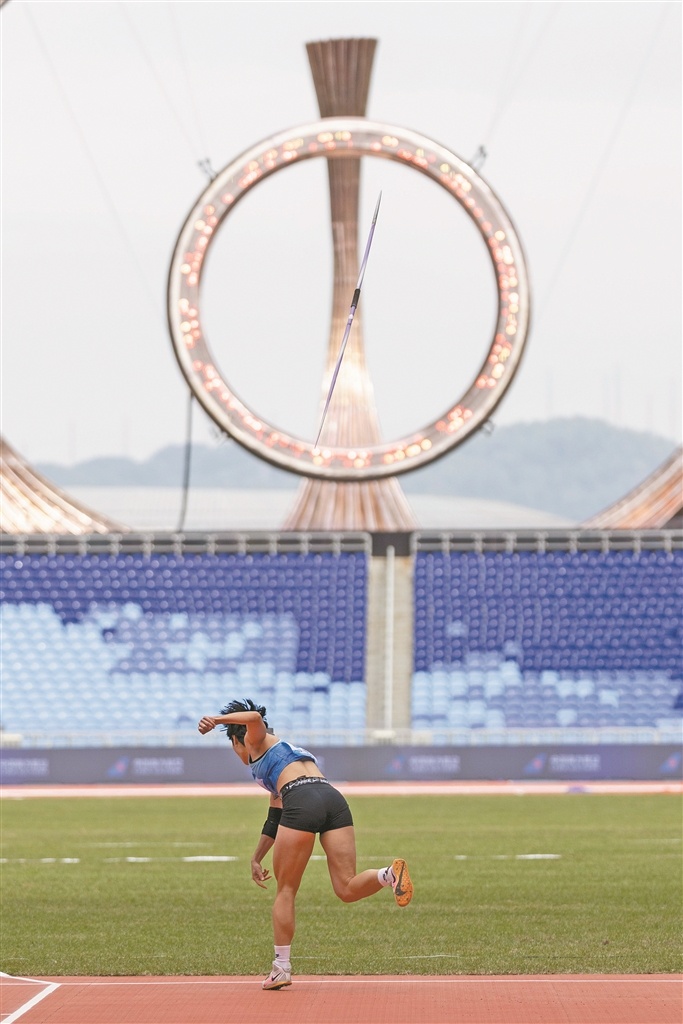 11月19日,广东奥体中心,女子田径项目七项全能之六标枪项目比赛正在进行中。