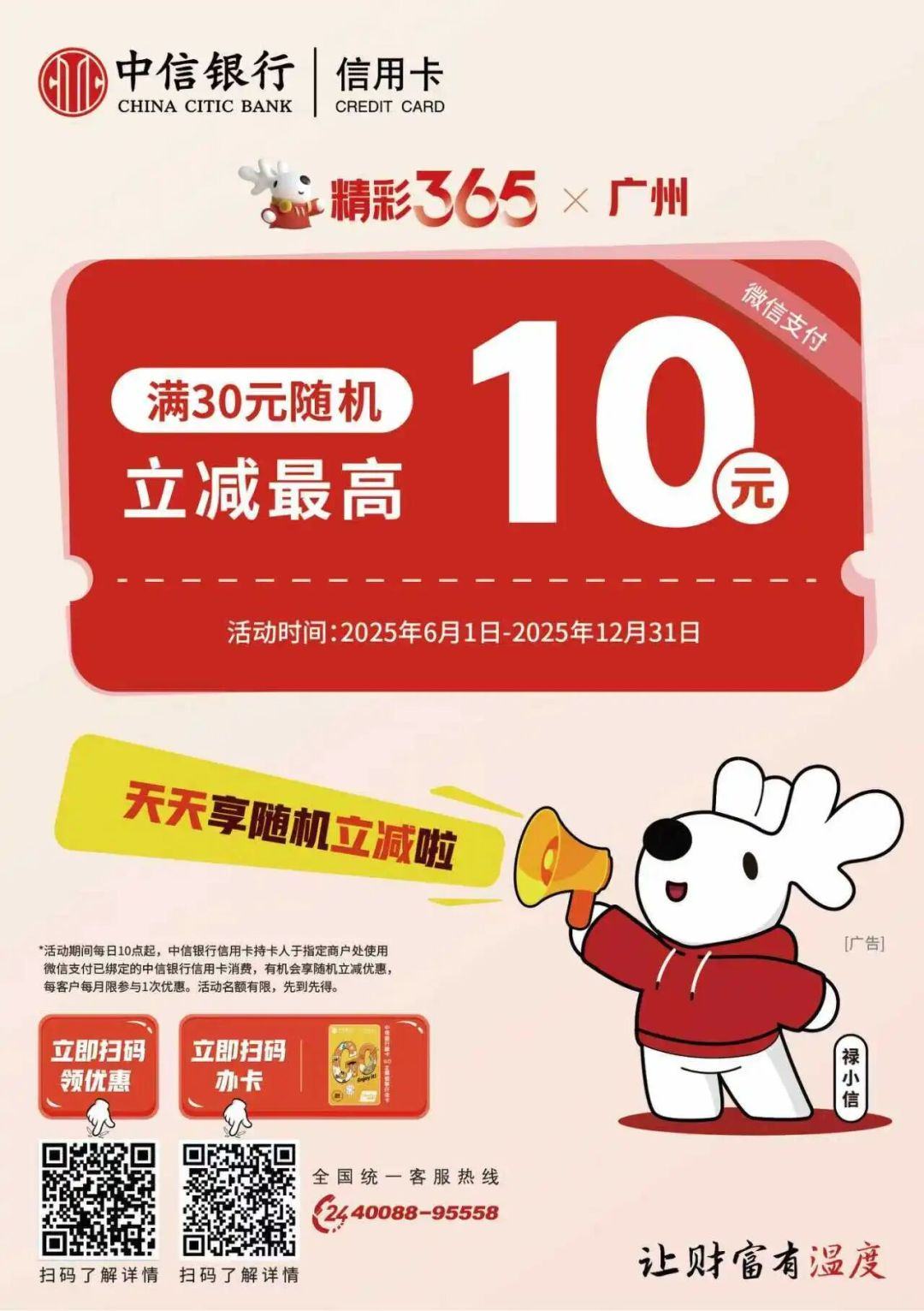 二是上线微信支付满立减活动,2025年11月1日至12月31日,中信银行信用卡持卡人每日10点起,在指定商户消费单笔满30元可享最高10元随机立减,满100元可享最高15元随机立减。
